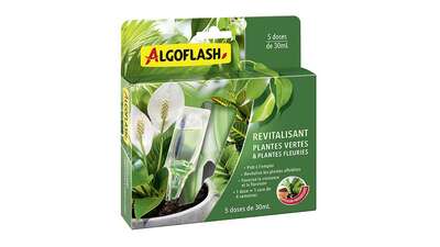 Les doses Revitalisantes Plantes Vertes et Plantes Fleuries Algoflash contiennent les éléments nutritifs (Azote, Phosphore, Potassium et oligo-éléments) indispensables à toutes les plantes d’intérieur : Ficus, Caoutchouc, Philodendron, Yucca, Aralia, Cissus, Fougère... Cet engrais permet de revitaliser les plantes affaiblies, en favorisant leur croissance, et de les aider à refleurir et retrouver des feuilles saines.