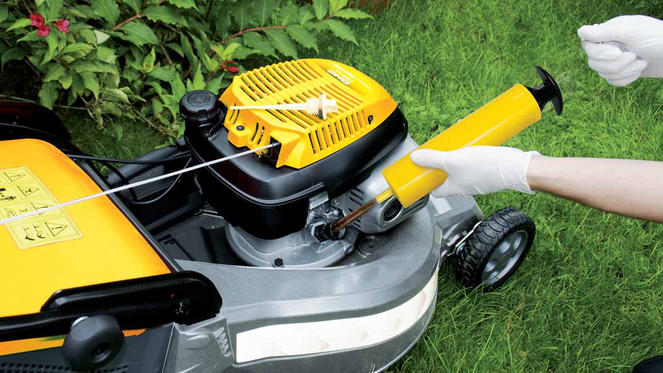 Le premier bidon d’huile doit être mis dans la tondeuse avant le 1er démarrage et tous les constructeurs préconisent une vidange au bout de 5 heures. La seringue, le bidon de récupération et le nouveau bidon d’huile permettront de faire la vidange facilement et proprement.
