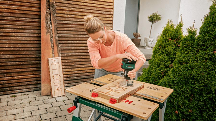 L’affleureuse polyvalente AdvancedTrimRouter 18 V-8 sans fil de Bosch est équipée de pinces de serrage de 6 mm et 8 mm pour accueillir des fraises de différents diamètres. Elle est donc idéale pour une multitude d’applications créatives dans le travail du bois, notamment pour le fraisage des bords, des rainures et des motifs décoratifs. C’est l’outil idéal pour arrondir facilement et de manière contrôlée les bords des pièces en bois. Elle peut être utilisée pour chanfreiner des bords à 45 °, fraiser des fentes dans l’étagère en bois pour le panneau arrière, et fraiser des rainures droites avec sa butée parallèle, graver des lettres et créer des motifs dans le bois.