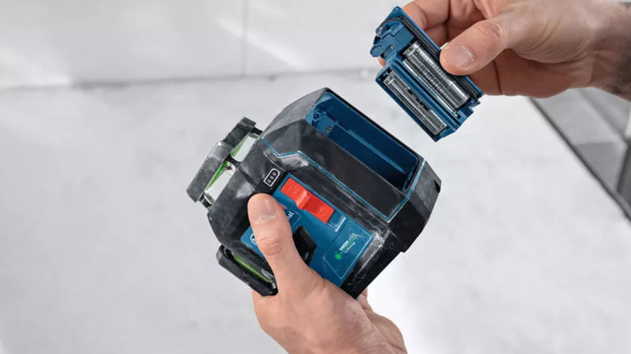 Le laser lignes GLL 80-33 G Professional 360 ° peut désormais fonctionner avec la nouvelle batterie lithium-ion BA 3,7 V 3,0 Ah XL Professional 3,7 V ou avec quatre piles AA pendant une durée maximale de 5 heures en mode normal avec trois lignes laser. La batterie peut être rechargée en cours d’usage via la connexion USB-C. À l’aide du clavier situé sur le dessus du boîtier, les utilisateurs peuvent contrôler chaque ligne laser individuellement et également activer le mode d’économie d’énergie. Le mode récepteur pour travailler avec un récepteur laser est toujours activé automatiquement, de sorte qu’aucun bouton supplémentaire n’est nécessaire.