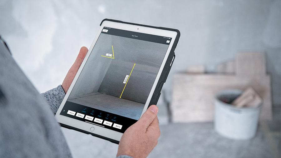 Avec l’application MeasureOn, les mesures peuvent être ajoutées aux photos, des plans organisés par pièces peuvent être dessinés rapidement et intuitivement avec un doigt, les photos et les notes peuvent être combinées dans une même vue… L’application calcule alors automatiquement les surfaces au sol, les surfaces des murs et la superficie de la pièce. Les erreurs de transmission manuelle sont éliminées par le transfert de données numériques et celles liées aux notes illisibles également.