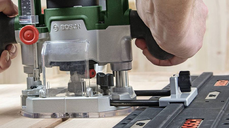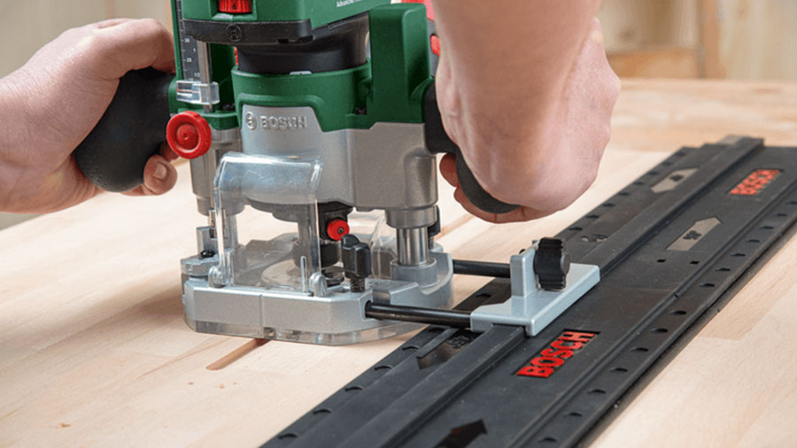 La défonceuse base plongeante sans fil 1600A02RD7 Bosch présente également l’avantage d’être compatible avec les butées parallèles et les adaptateurs pour rail de guidage Bosch pour le fraisage de rainures droites. L’adaptateur pour rail de guidage s’adapte à la butée parallèle Bosch HG existante de POF 1400 et POF 1200.