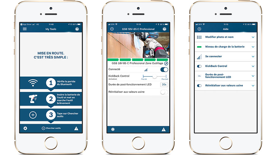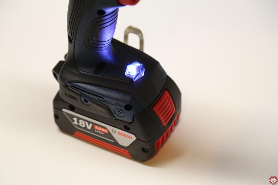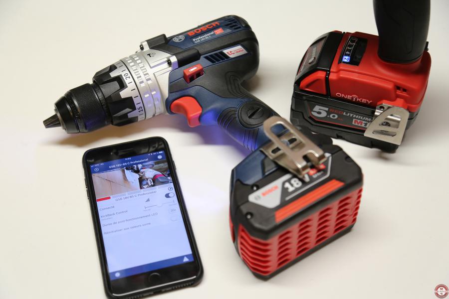 La perceuse-visseuse à percussion GSB 18V-85 C est dotée d’un module Bluetooth Low Energy Module GCY 30-4, une technologie radio Bluetooth qui permet de transférer les données et les réglages de l’outil électroportatif entre la machine et un terminal mobile (IOS ou Android). Lors de notre test de connectivité, l’appareillage entre la GSB 18V-85 C et le téléphone s’est avéré très simple, les étapes sont bien décrites dans l’application. En revanche, les fonctionnalités sont très limitées. Nous pouvons visualiser la charge restante de la batterie, modifier l’activation du Kick Back Control sur 3 positions et de régler la temporisation de l’éclairage LED de 0 à 99 secondes. Face à la solution concurrente ONE-KEY de chez Milwaukee, les fonctionnalités sont nettement plus abouties. L’utilisateur pourra géolocaliser l’outil, désactiver l’outil, commander la vitesse de rotation, le démarrage progressif, le débrayage, l’intensité d’éclairage ou encore paramètres des séquences de réglages en fonction des applications à effectuer comme les perçages techniques de type taraudage.