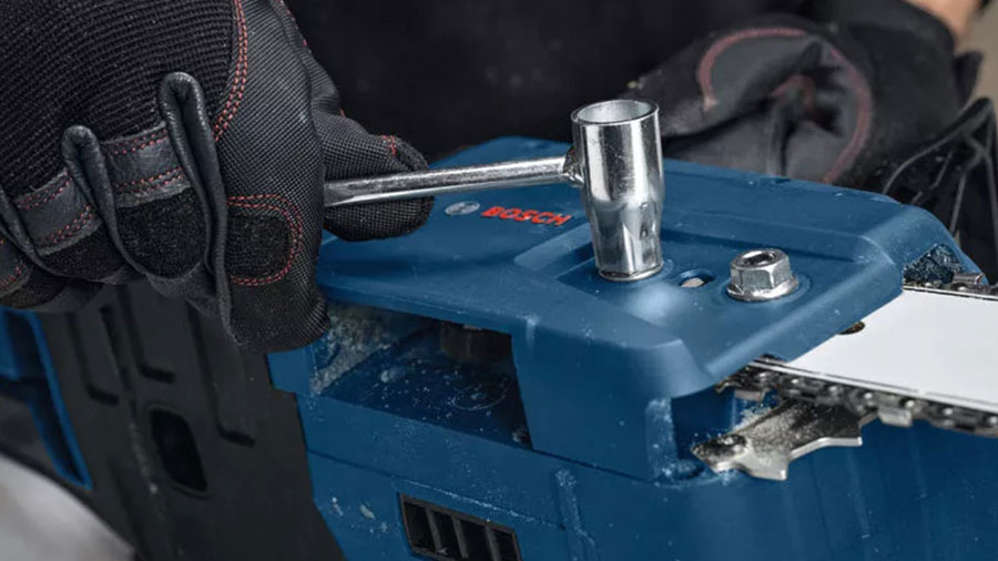 L’utilisateur peut serrer la chaîne de manière précise et fiable grâce à une vis de réglage. Ce système de tension de chaîne robuste et compact offre aux opérateurs la possibilité de couper près des murs, par exemple pour raccourcir les poutres des fermes de toit. L’outil de tension de chaîne scrench peut être rangé dans la poignée de la tronçonneuse, ce qui permet de l’avoir toujours à portée de main. La chaîne est lubrifiée automatiquement. Le réservoir d’huile transparent est parfaitement étanche et permet à l’utilisateur de toujours garder un œil sur le niveau de remplissage.