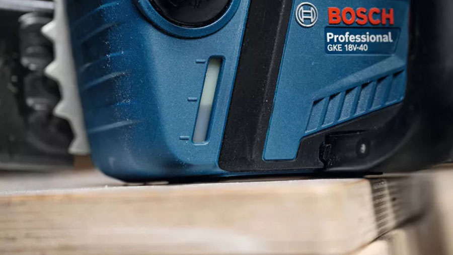 Avec la GKE 18V-40 Professional Bosch, la batterie ProCore18V recommandée de 12,0 Ah remplit presque entièrement le compartiment de la batterie. La sciure de bois peut être facilement évacuée par une ouverture dans le compartiment à batterie plus petite. Elle offre une bonne autonomie pour réaliser efficacement l’intégralité de vos projets sans interruption. Elle permet d’effectuer 110 coupes avec une batterie 18 V de 5,5 Ah, 160 coupes avec une batterie 18 V de 8,0 Ah et 250 coupes avec une batterie 18 V de 12,0 Ah, de bois tendre de 10 x 10 cm.
