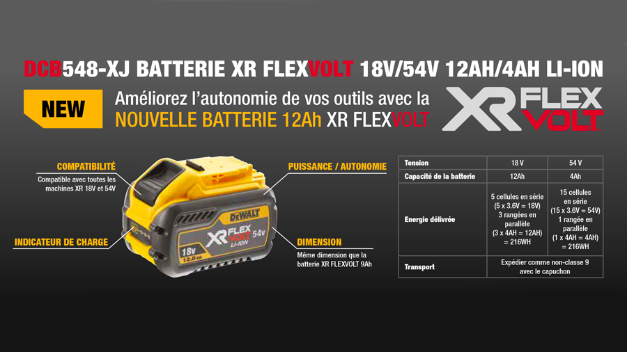 Vous souhaitez en apprendre plus sur cette nouvelle batterie ? Consultez notre article : DEWALT présente la première batterie hybride XR FLEXVOLT 18/54 V de 12,0 Ah.