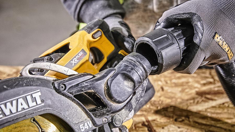 L’insertion de la batterie 54 V XR FLEXVOLT DEWALT s’effectue sur le dessus de l’outil pour un meilleur équilibre. Pratique, la scie circulaire DCS577 dispose d’un crochet à chevron en métal pour accrocher la machine sans risques lors des travaux en hauteur. Enfin, pour travailler dans un environnement sans poussière, la scie circulaire est compatible avec le système Airlock DEWALT. Ce système permet de raccorder un aspirateur DEWALT en quelques secondes.