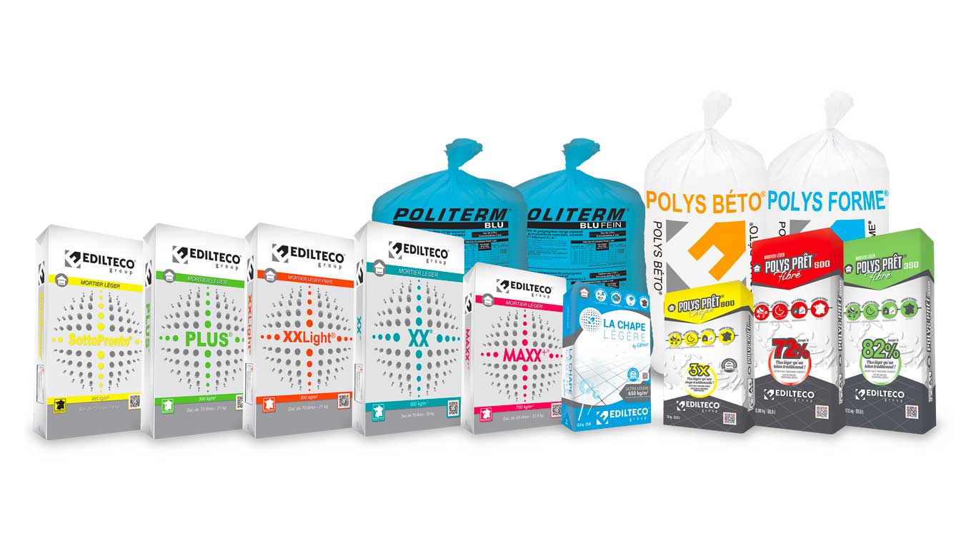 En cohérence avec cette stratégie, Edilteco a entièrement revu le packaging de ses deux prestigieuses gammes de chapes et mortiers légers prêts à l’emploi (les gammes sol PRÊT À L’EMPLOI et POLYS PRÊT) afin d’offrir aux professionnels du bâtiment une identité graphique adaptée, signifiante et identifiable.