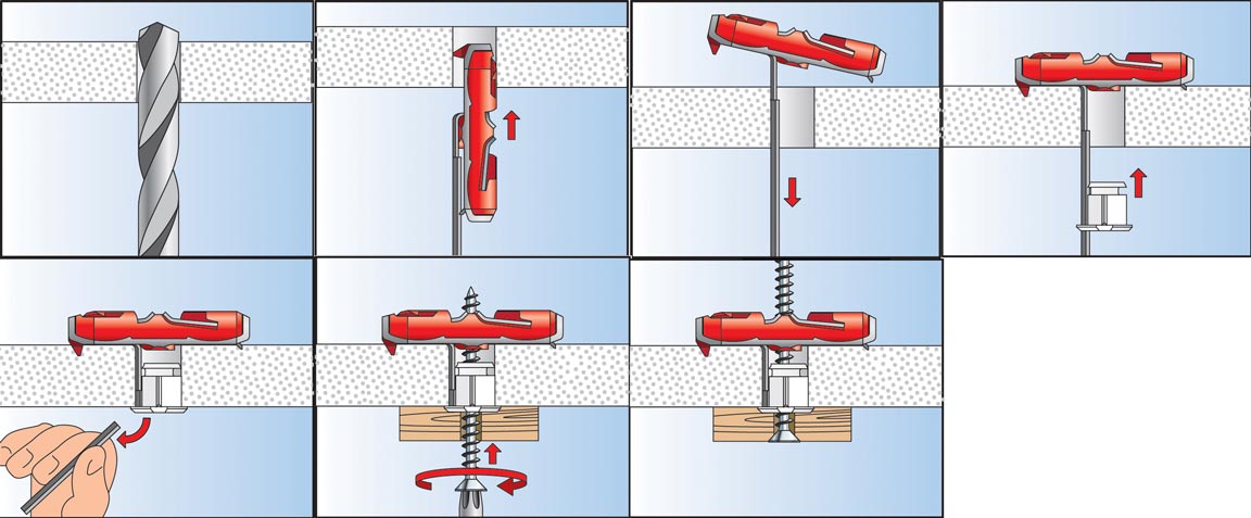 Il suffit de placer la cheville à bascule parallèlement à la longue tige crantée, de l’insérer dans le forage avec le marquage de la flèche vers le haut. Il faut ensuite pousser la douille blanche le long de la tige crantée, jusque dans le forage, et rompre cette tige en la pliant. La force du ressort en nylon assure l’expansion derrière la plaque de plâtre. La pose de vis à bois est recommandée, mais cela fonctionne également avec des vis métriques.