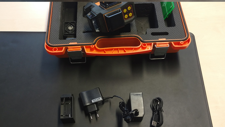 Le support possède une hauteur ajustable d’environ 20 cm. Polyvalent, il peut-être attaché par une sangle et fixé sur un trepied 5/8 ». De plus, Il est également vendu avec une cellule verte permettant d’augmenter la distance de portée de 40 à 70 m de rayon. On regrettera le manque de lunettes vertes. Pour faciliter son transport, le niveau laser GEO6X SP GREEN KIT 360° x 3 est livré dans une boite en plastique rigide et protégé par un bloc en mousse.