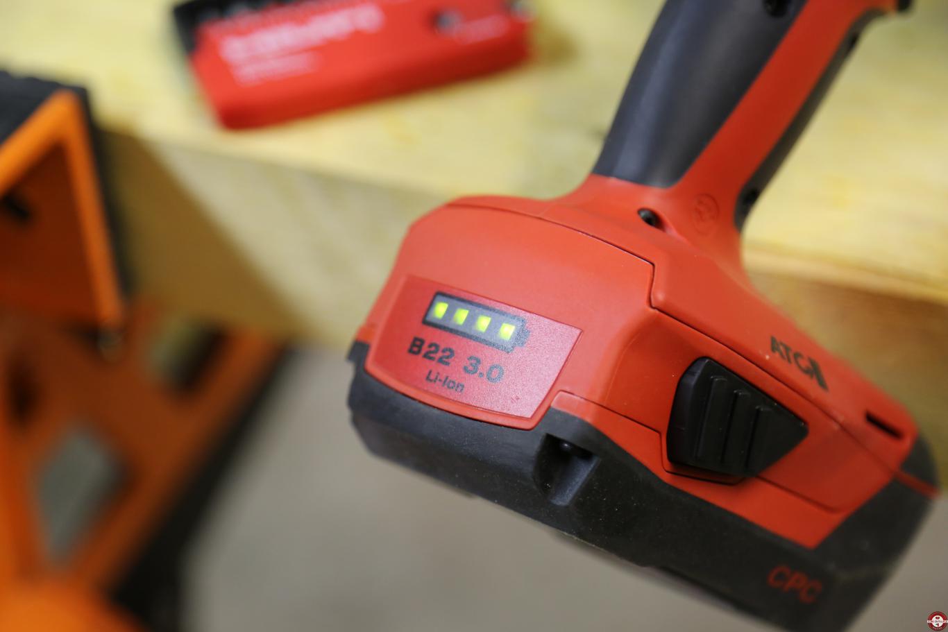 Rien à redire sur l’ergonomie et l’équilibre de la machine, la perceuse-visseuse à percussion Hilti SF 6H-A22 tient parfaitement en main, même gantée. Le point fort de cette nouvelle perceuse-visseuse Hilti, est son système ATC. Nous avons simulé de nombreux blocages lors de travaux de transpercement dans le bois, la machine a détecté à chaque occasion le blocage de la mèche. Lors de nos tests de la SF 6H-A22, nous avons utilisé la nouvelle batterie Hilti B 22/3.0 haute performance 22 V 3,0 Ah utilisable sur une plage de températures de -20 °C à + 60 °, elle présente l’avantage d’être compacte tout en garantissant une bonne autonomie. On notera que la machine est compatible avec les batteries haute capacité Hilti 22 V 5.2 Ah - B 22/5.2 et les batteries Hilti 22 V 2.6 Ah - B 22/2.6.
