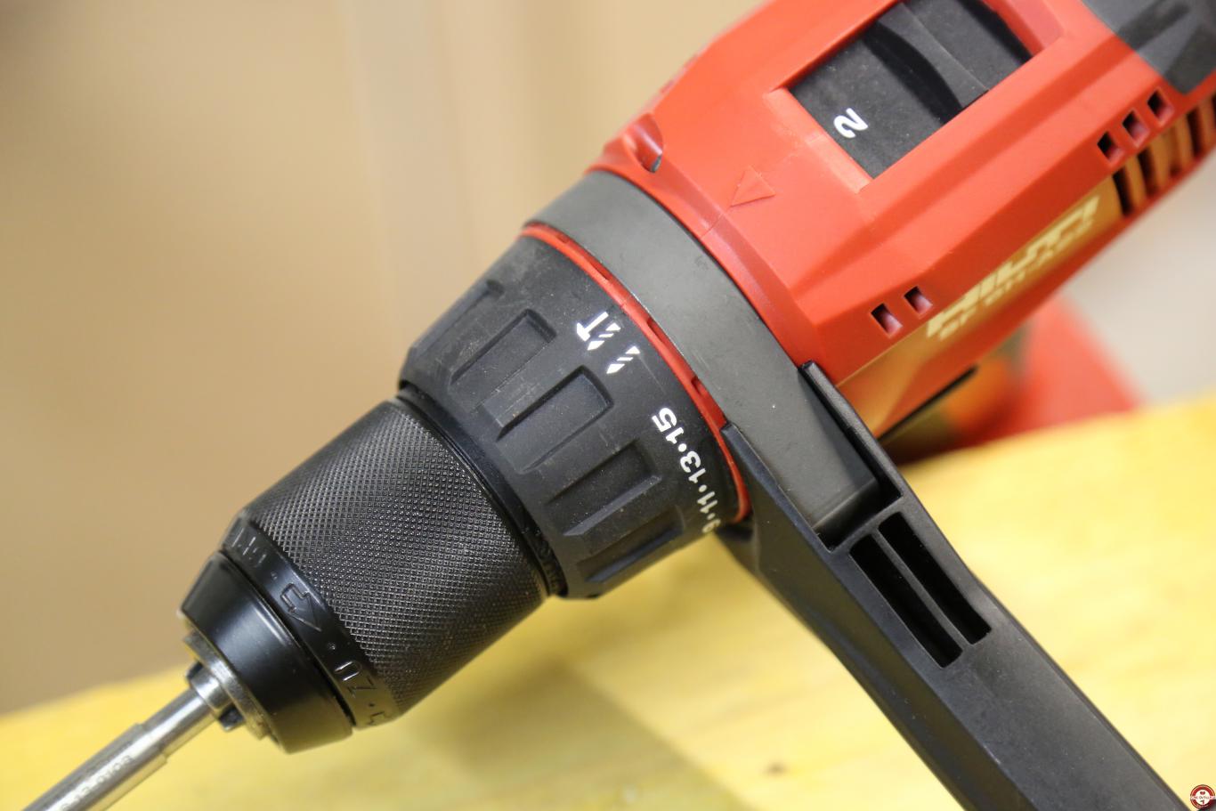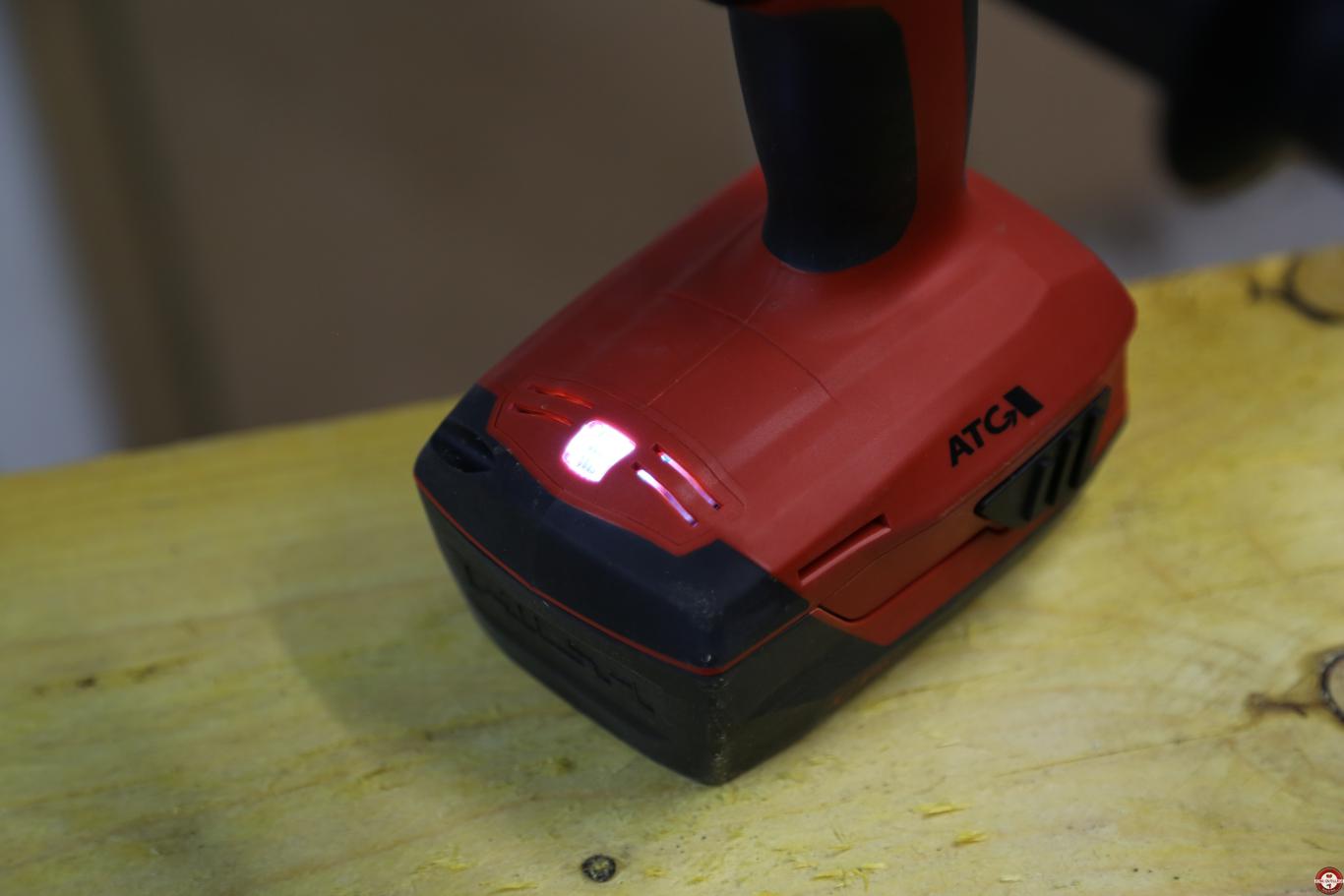 Le réglage de couple se fait sur 15 positions, la bague est facile à manipuler. L’inverseur de sens tombe bien entre l’index et le pouce, la prise en main est agréable. Côté sécurité, HILTI a intégré un système d’antitorsion contrôlée (ATC) qui permet de bloquer l’outil quand une mèche se bloque. Idéal pour la sécurité de l’utilisateur, notamment lors des travaux de perçage en hauteur, le gyroscope détecte le blocage et arrête immédiatement le moteur. Enfin pour le confort de l’utilisateur, un éclairage LED est présent sur la base de la machine.