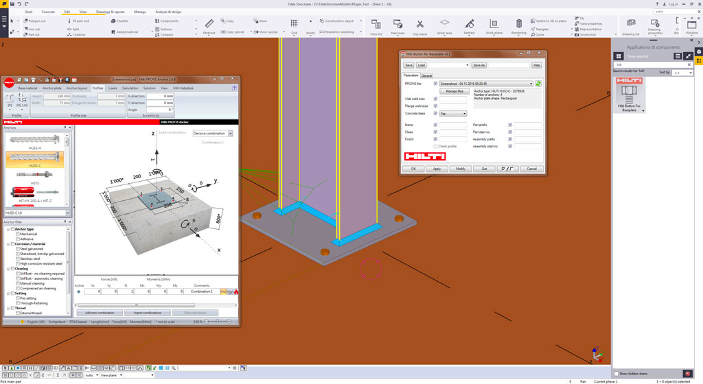- Partage de données de projet entre applications logicielles – Le plugin Hilti PROFIS pour Tekla Structures permet aux ingénieurs et aux projeteurs d'appliquer des données de projet de PROFIS directement dans une modélisation Tekla Structures grâce à la plateforme d'échanges Trimble Connect.