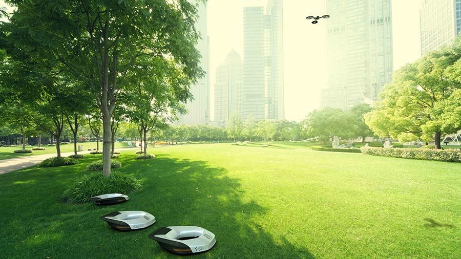 - Le drone de transport reçoit les coordonnées de localisation et l’itinéraire prioritaire des différentes zones d’entretien à partir du Cloud. Il transporte les robots tondeuses et l’éclaireur vers les zones définies. Alimenté par l’énergie solaire, il recharge les tondeuses et l’éclaireur, même pendant le vol.