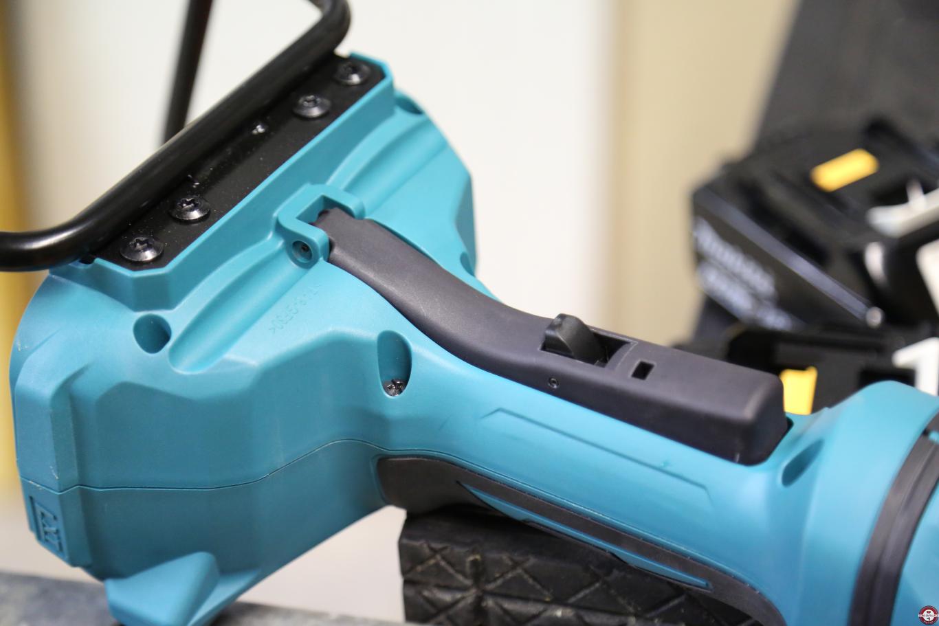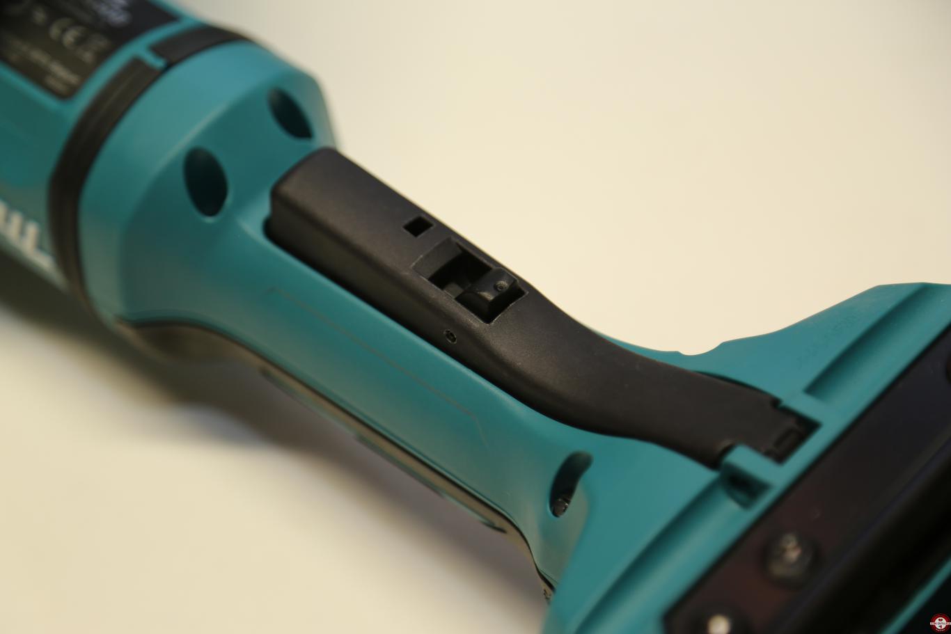Nous avons testé le modèle Makita DGA900PT4, une meuleuse sans fil 230 mm livrée avec coffret MakPac de 4 batteries BL1850B 18 V 5,0 Ah munies d’un témoin de charge et un chargeur rapide double slot DC18RD ventilé. Il s’agit de la deuxième meuleuse sans fil 230 mm du marché, en concurrence directe avec la Metabo WPB 36-18 LTX BL 230 qui fonctionne également avec deux batteries 18 V. La conception et la prise en main de la Makita sont différentes, la poignée principale de la DGA900 est fine et recouverte d’un grip, elle offre une bonne prise en main. La machine est équipée d’un interrupteur paddle « homme mort » qui empêche la machine de démarrer par erreur et s’arrête lorsque l’on relâche la gâchette.
