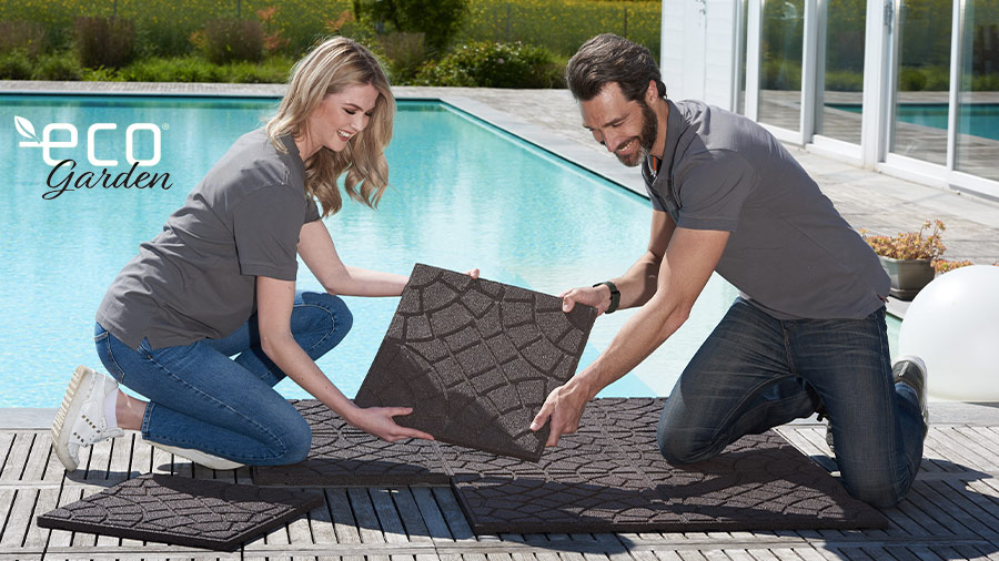 Découvrez en exclusivité la nouvelle gamme de dalles et de bordures en caoutchouc recyclé Eco Garden Ribimex.