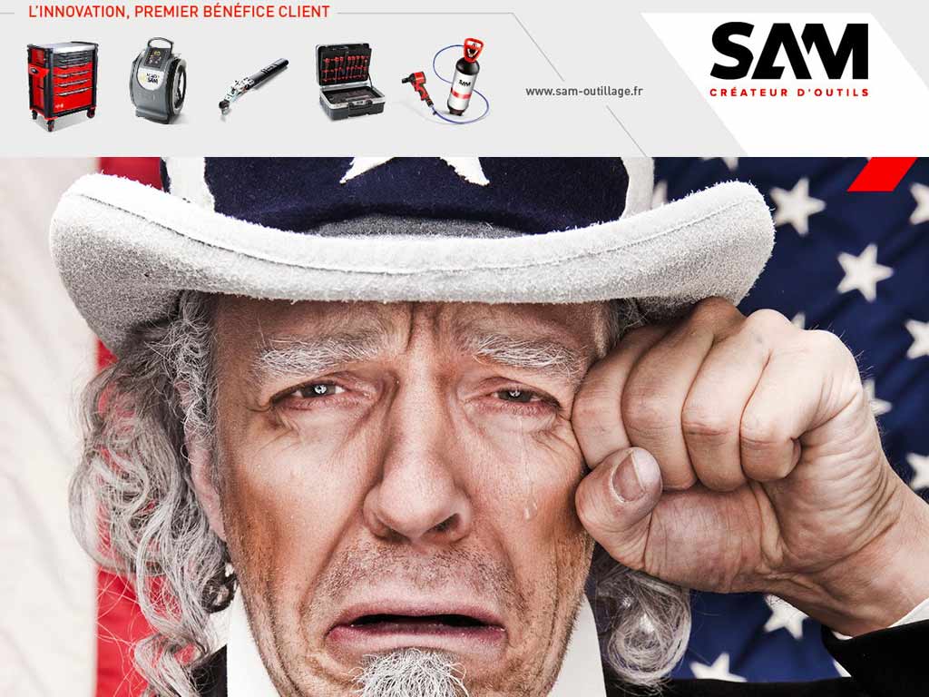 Pour réaliser cette campagne l'agence de communication de la marque a choisi deux niveaux de communication ; le premier ici illustré, a pour objectif de dire aux univers de l’automobile, de l’industrie, du bâtiment et de l’outillage au sens large, que SAM, société française, ère de ses racines, ne cesse d’innover. L’Oncle SAM, triste, porte le message souligné par la signature : « Sorry... c’est français ! »