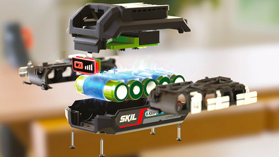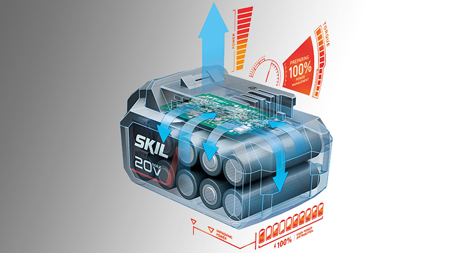 Toutes les batteries de la plateforme Energy SKIL sont équipées de la technologie ActivCell : un circuit imprimé permettant de reconnaître l’outil et de communiquer avec lui, mais aussi de gérer individuellement chaque cellule et d’optimiser leur fonctionnement entre elles. Les informations des cellules sont ainsi transmises à la carte ActivCell qui répartit l’énergie à fournir selon leur capacité, afin d’équilibrer les ressources et de préserver la batterie.