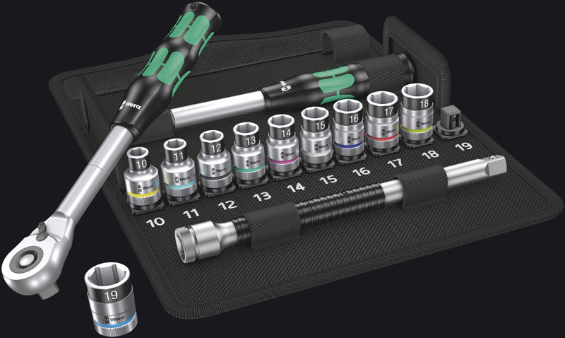 Le Zyklop Hybrid est disponible en jeu, lequel est composé du cliquet et de la rallonge, ou disponible en composition, comprenant un cliquet et sa rallonge ainsi que dix douilles, avec fonction de retenue, de 10 à 19 mm et d’une rallonge de douille à bague flottante pour un vissage ou dévissage-éclair des vis et des écrous. En sûreté et facile d’accès, le jeu de cliquets est rangé dans sa trousse textile semi-rigide.