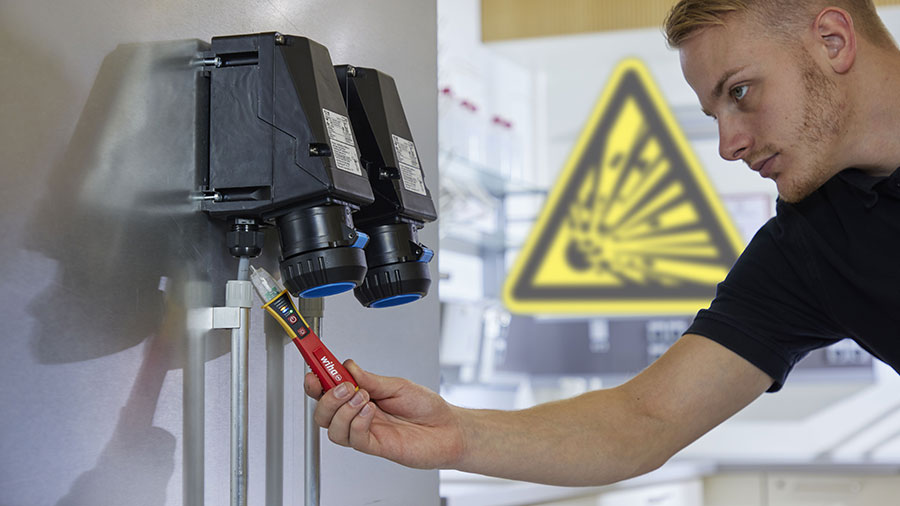 Le détecteur de tension sans contact 44309 Wiha est la seule version homologuée selon la norme ATEX pour une utilisation en zones explosives (catégorie II). C’est un testeur de tension unipolaire 12 -1000 V AC conforme à la norme EN 61010-1 / IEC 61326 avec une catégorie de mesure CAT IV 1 000 V CA. Pendant le test de tension, les LED s'allument du bleu (faible), à l'orange, jusqu'au rouge (fort) en fonction de l'intensité du champ électrique alternatif.