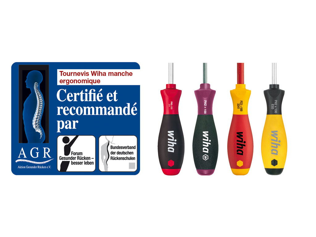 Wiha, l’un des principaux fabricants d’outils manuels, distinguée comme « Meilleure PME d’Allemagne » en 2014 par le prix MX Award, a toujours misé sur un concept de taille de manche ergonomique appliqué à ses gammes d’outils de vissage SoftFinish, SoftFinish electric, SoftFinish ESD et MicroFinish. Ce concept, qui permet à l’utilisateur de travailler plus longtemps, plus confortablement et surtout sans douleur, a maintenant été récompensé par AGR qui lui a attribué le label de qualité AGR.
