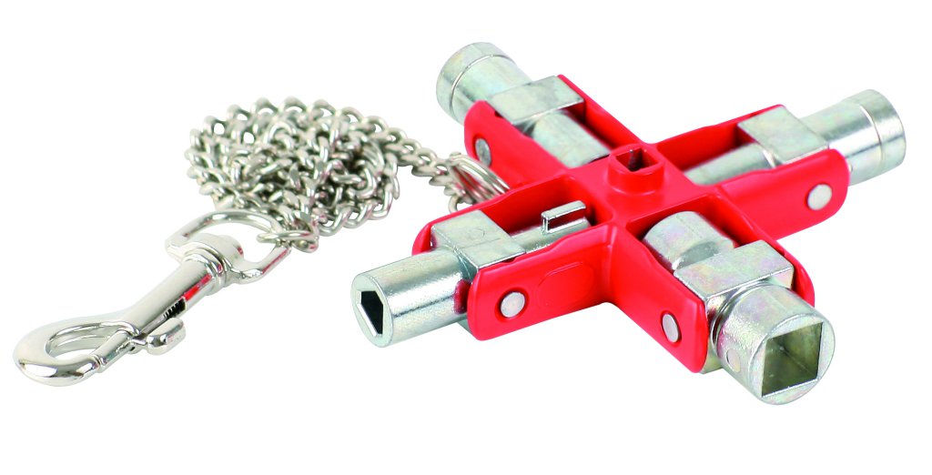 Dotée d’un porte-embout 1⁄4‘’ magnétique au centre de la clé, cette dernière mesure 95 x 95 mm pour un poids de 175 grammes. Un réel gain de temps pour les utilisateurs qui n’auront qu’un seul et même outil au quotidien pour les fermetures d’armoires électriques ou pour les accès aux gaines par exemple. Cette clé universelle possède également une chaînette et un mousqueton pour un maniement beaucoup plus aisé !