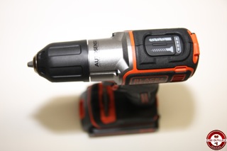 L’équilibre général est bon, la machine est légère (1,1 kg batterie comprise). L’ergonomie a été pensée pour un usage mixte. L’inverseur de sens se manipule facilement, il tombe bien sous l’index et le pouce. Le mandrin autoserrant 10 mm est en plastique et non en métal comme l’a indiqué le fabricant sur son site officiel. Il permet d’utiliser les principaux forets et portes-embouts standards du marché. Il n’y a aucune bague de réglage de couple puisqu’il est automatique. Sur le dessus de l’outil, l’utilisateur peut choisir entre la fonction perçage ou la fonction vissage.
