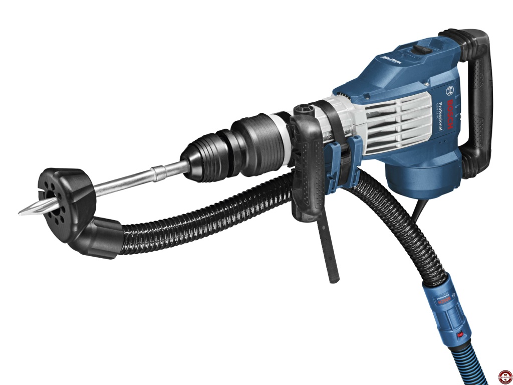 Le dispositif d’aspiration de poussière GDE hex Professional s’adapte sur tous les brise-béton de la gamme Bosch ainsi que sur le marteau-piqueur SDS max GSH 11 VC Professional. Le dispositif d’aspiration se fixe sur le nez de l’outil au moyen d’un système de serrage rapide, et peut être adapté à différentes positions de travail et à différents accessoires. Il se compose d’une ventouse qui enveloppe le burin et d’un tuyau d’aspiration raccordé dessus et fixé au niveau du système de serrage rapide. Si l’accessoire doit être remplacé, la ventouse à fente peut être enlevée rapidement puis remplacée immédiatement. Il n’est pas nécessaire de procéder à une insertion ou un retrait par le bas. De la sorte, le dispositif d’aspiration de poussière peut également être fixé ou retiré facilement sans avoir à retirer le burin, même dans le cas de burins bêches de grande taille.Outre l’avantage d’être respectueux pour la santé, il permet également de protéger l’outil, ce qui est particulièrement important notamment dans le cas des brise-béton : il évite que la poussière pénètre dans les ouïes d’aération et se dépose dans le moteur ou dans le porte-outil. Il en résulte une plus grande longévité de l’outil et une plus grande durée de vie du burin.
