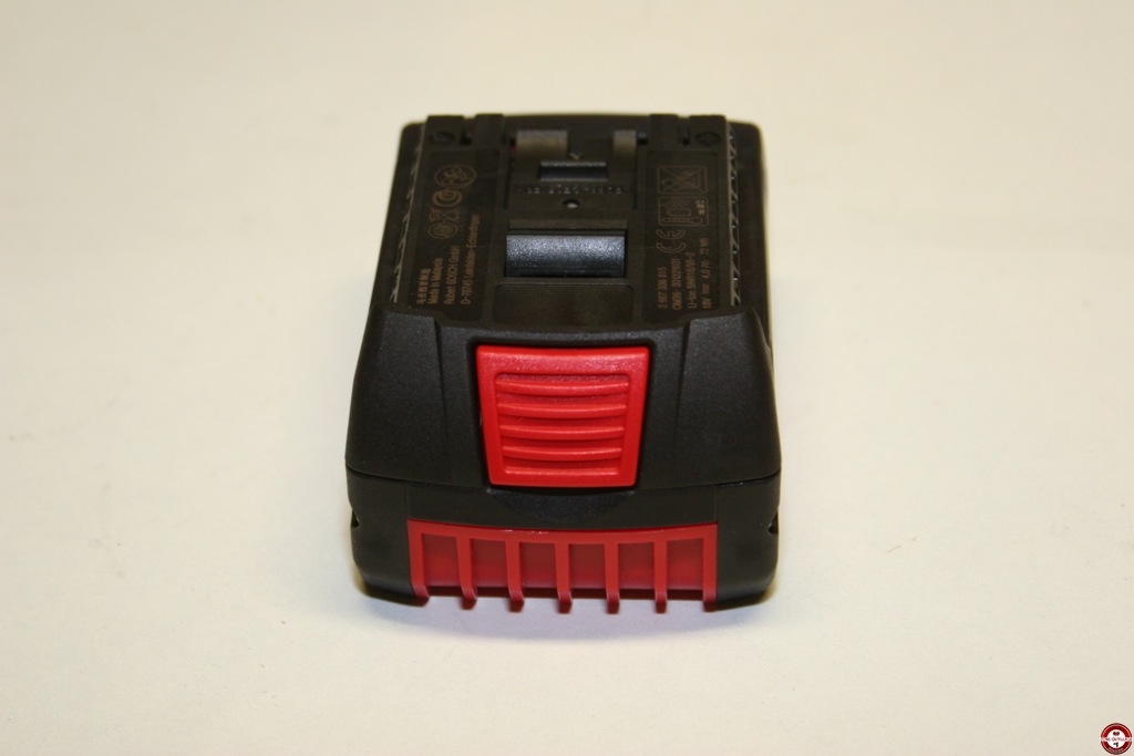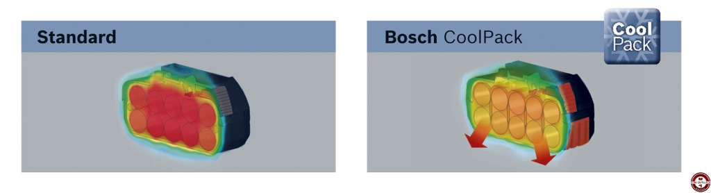 La perceuse-visseuse Bosch Professional GSB 18-VE-2-LI est équipée de la nouvelle batterie Lithium-Ion 4.0Ah dotée de la technologie CoolPack. Contrairement aux autres batteries de la concurrence qui ont opté pour la surveillance électronique des cellules pour stopper la batterie ou la machine en cas de surchauffe ou surintensité, Bosch a choisi une autre solution avec son système CoolPack. Les batteries ont un logement d’une forme spéciale, les cellules sont insérées avec préciion dans un dissipateur rouge auquel elles sont collées de façon thermique grâce à un polyéthylène de très haute densité qui est un très bon conducteur de chaleur et isole électriquement. La sécurité de la batterie se trouve augmentée. Les ailettes de refroidissement fixées sur l’extrémité inférieure offrent une plus grande surface d’échange et dissipent la chaleur vers l’extérieur.