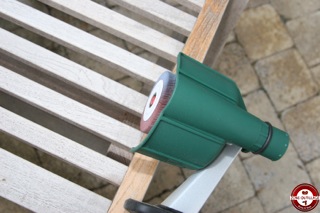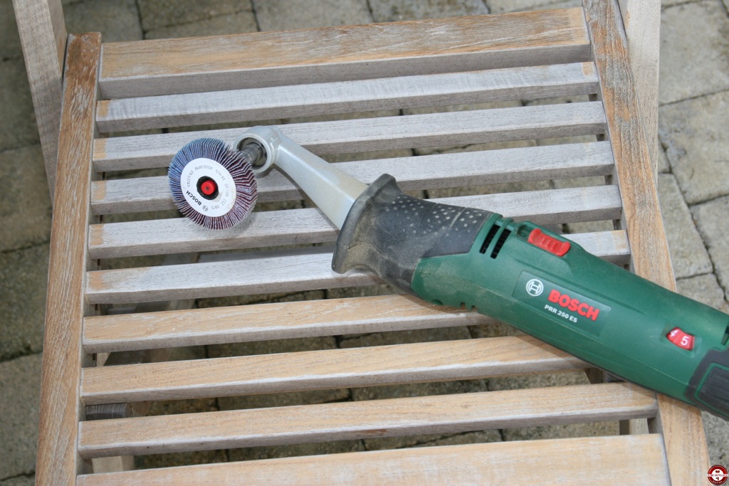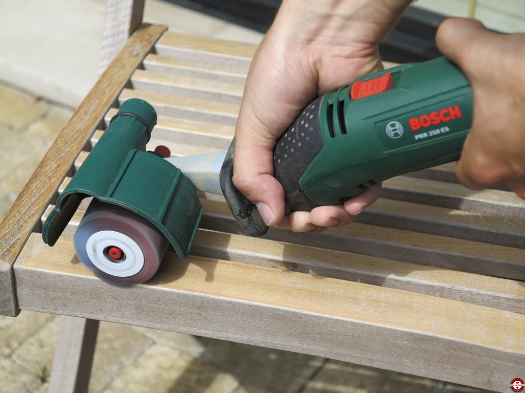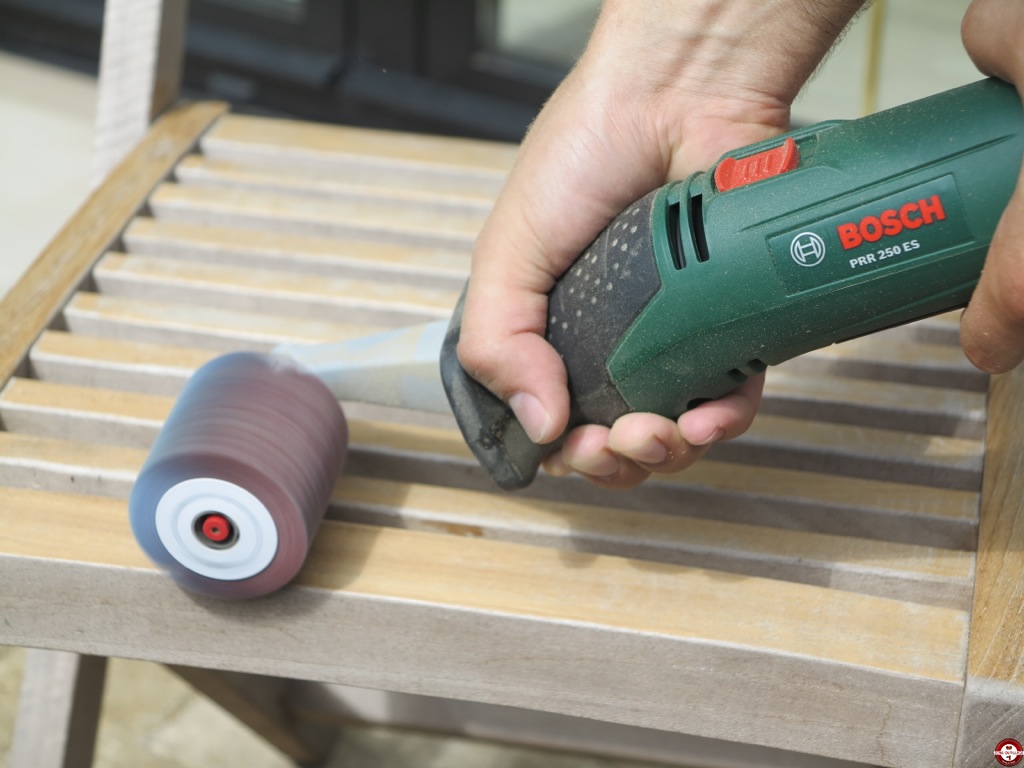 Pour les bricoleurs ayant déjà transformé leur perceuse en ponceuse pour décaper ou poncer à l’aide d’une brosse ne nylon ou un disque de ponçage, le principe est le même avec la nouvelle ponceuse Bosch PRR 250 ES. Il y a toutefois des différences majeures comme l’ergonomie, la sécurité et la prise en main. Nous avons testé les différents accessoires fournis dans le coffret. Nous avons voulu nous attaquer à une tâche rebutante, le ponçage d’une chaise en Teck afin de lui redonner un bel éclat. À la main ce type de travaux est vite décourageant et impossible à effectuer avec une ponceuse ordinaire vu la complexité des surfaces à poncer. Avec les accessoires fournis dans le coffret de la PRR 250 ES, vous disposez d’une base pour le ponçage du bois.