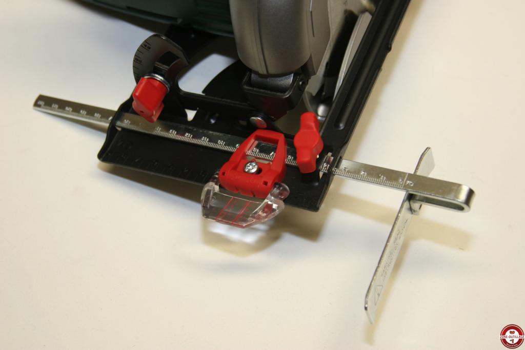 On regrette qu’il n’y ait aucun témoin de charge restante sur la batterie ni même sur la scie circulaire. Sur le devant de l’outil, un bouton permet le blocage de la broche, l’utilisateur peut changer de lame facilement à l’aide de la clé six pans fournie. Enfin sur le devant de la semelle le fabricant a ajouté un guide de coupe « cut control », il permet de guider la scie le long du trait de coupe à 90° et 45°.
