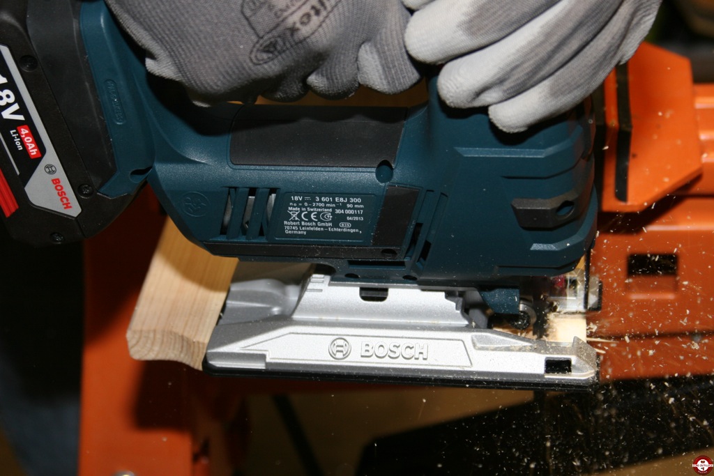 La maniabilité et le confort de la scie sauteuse Bosch GST 18 V-LI sont irréprochables y compris pour les coupes courbes dans les endroits exigus. Le blocage et déblocage de la sécurité se fait d’une seule main. Le changement de lame s’effectue rapidement. Lors de nos tests effectués dans le bois (lames de parquet massif, lames de parquet stratifié, agglo, contreplaqué fin, bastaing…) La machine s’est montrée véloce, nous avons adapté la lame correspondante à chaque type de matériau et le résultat est parfait et sans éclats.