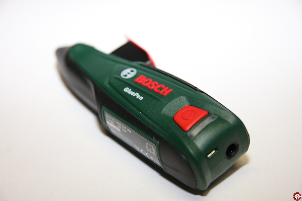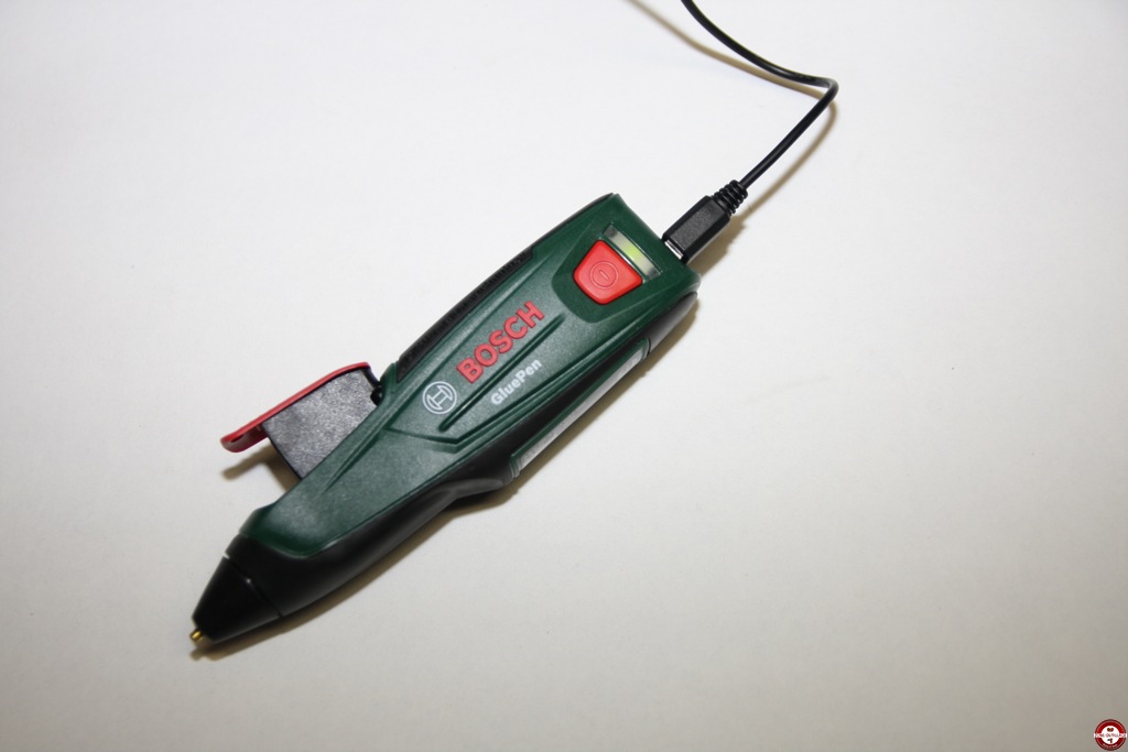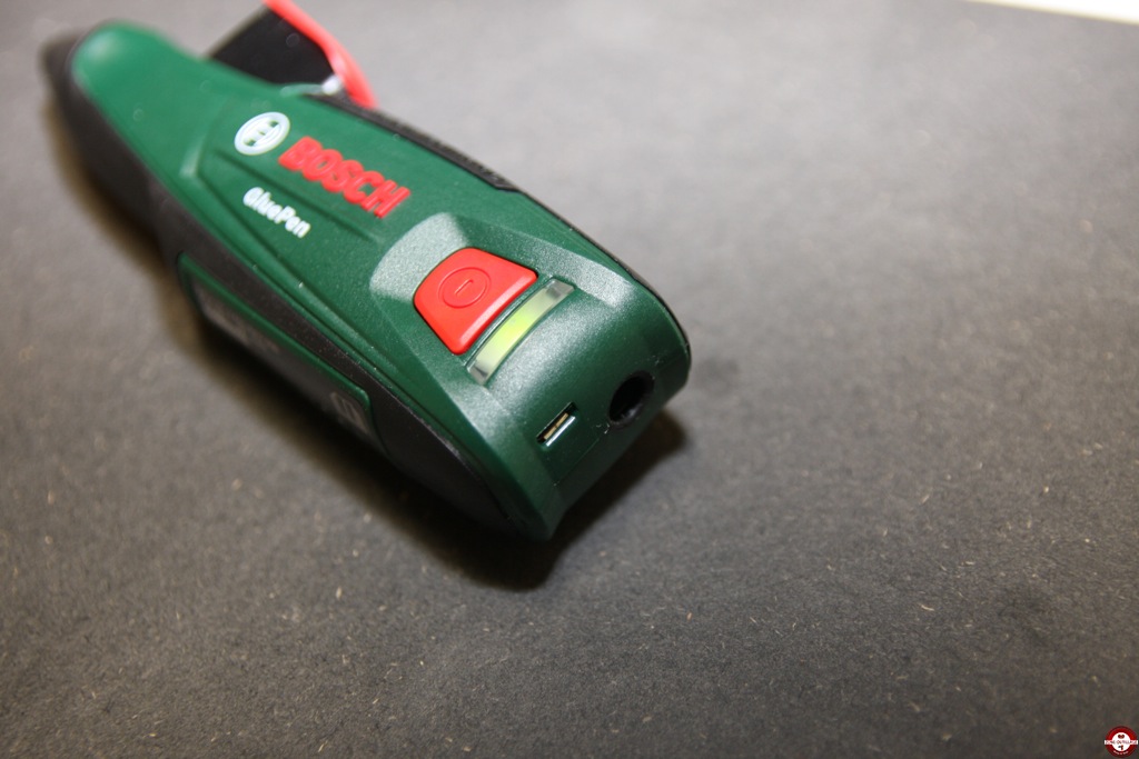 Avant le test, nous avons rechargé le GLUEPEN avec le chargeur fourni cependant Bosch a opté pour un embout micro USB qui permet de le recharger sur un ordinateur comme un téléphone portable. Une fois chargé, il suffit d’insérer un bâton de colle à l’arrière du GLUEPEN.