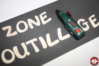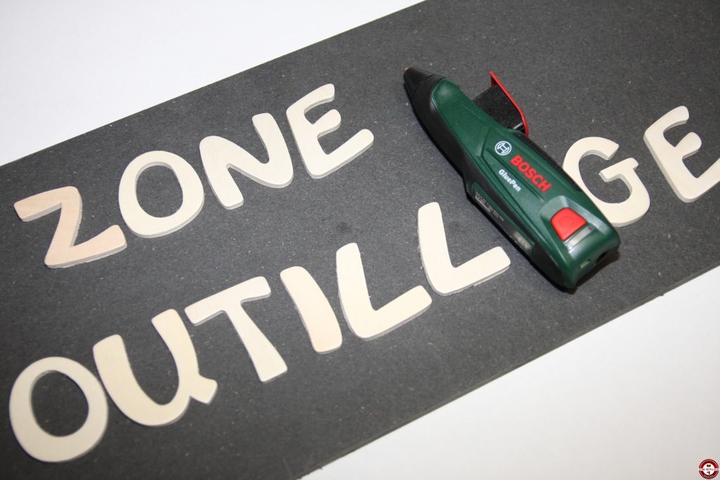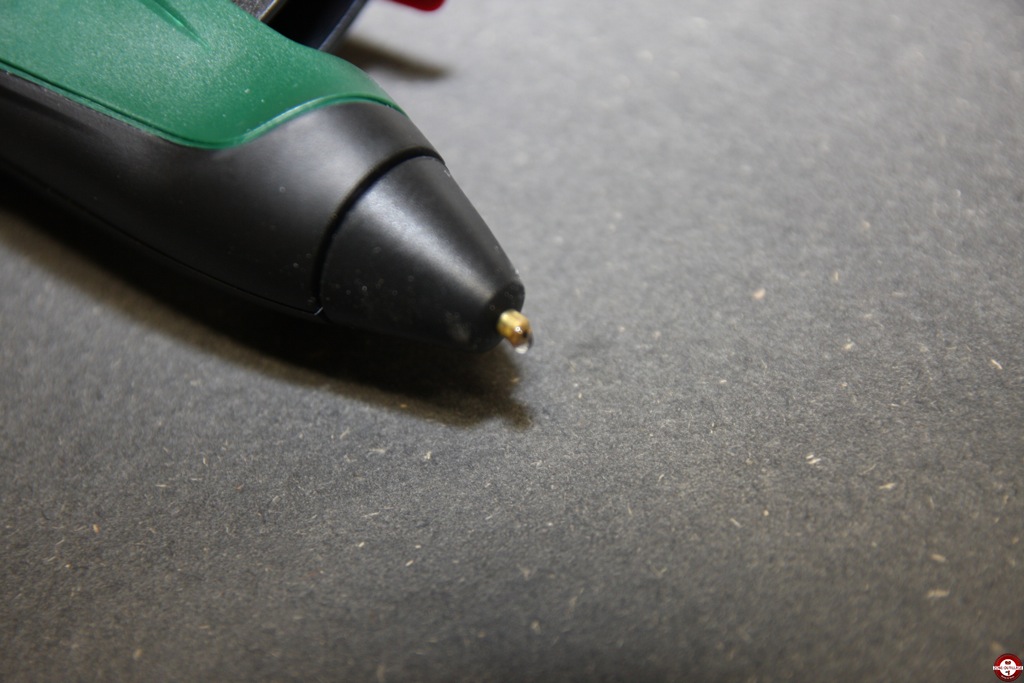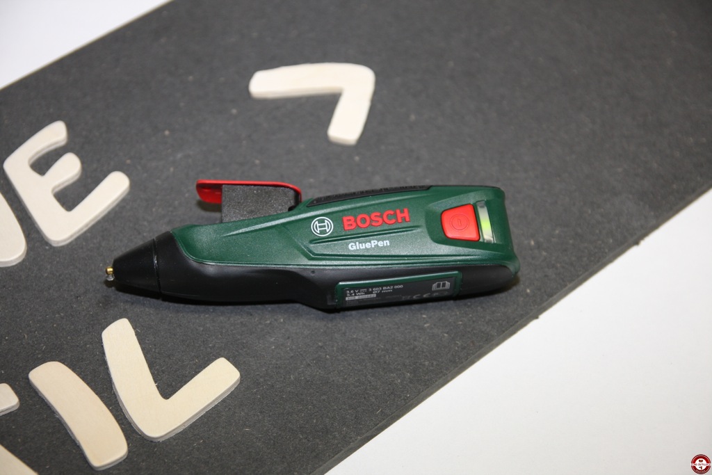 Lorsque l’on allume l’outil, une LED verte clignote et au bout de 15 secondes, la diode verte reste fixe ce qui signifie que l’outil a atteint la température de 170ºc, qu’il est prêt à l’emploi. Nous avons collé des lettres en bois sur une plaque de médium. La gâchette se presse facilement, il faut un petit temps d’adaptation pour jauger le débit de colle, mais au bout de quelques manipulations, le geste est plus précis. Lorsque l’on relâche la gâchette, Le Gluepen transfère automatiquement l’excès de colle dans l’appareil, ce qui assure un collage propre. Seule l’extrémité du stylo à colle est brulante. Lors de l’utilisation, nous n’avons ressenti aucune chaleur sur le reste de l’outil.