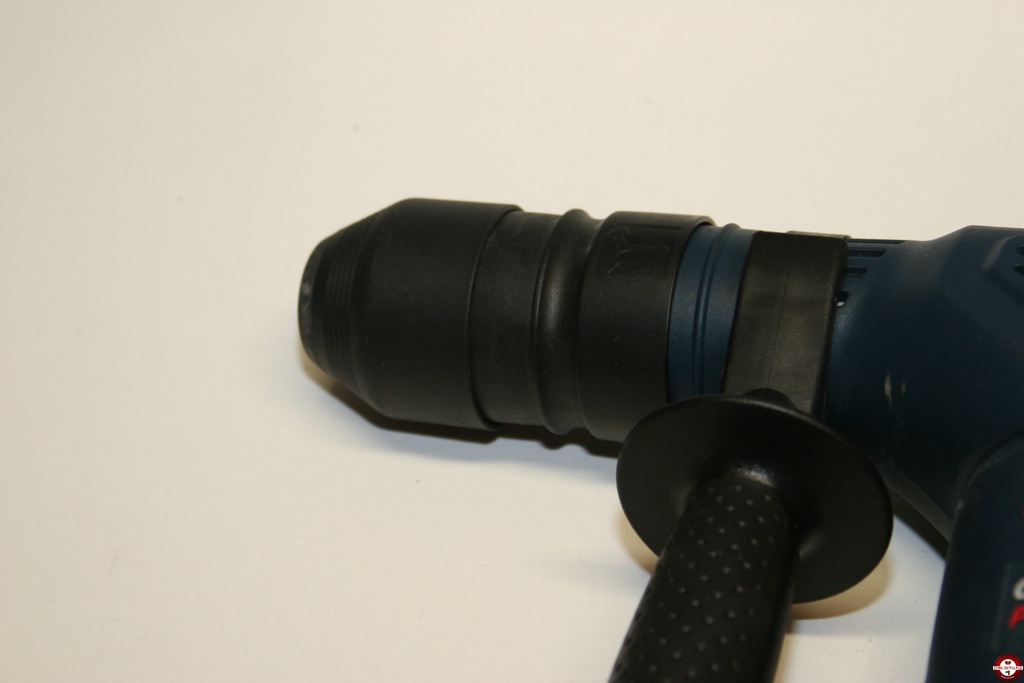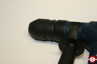 Le marteau piqueur est livré dans un coffret de transport plastique un peu fragile avec une poignée supplémentaire, un set de 3 burins (Burin pointu, Bêche carrelage 260 x 40 mm, Burin plat) et un tube de graisse. Le porte-outil SDS + est imposant, les burins s’insèrent sans difficulté, la poignée supplémentaire est basique et dépourvue de système anti-vibration.
