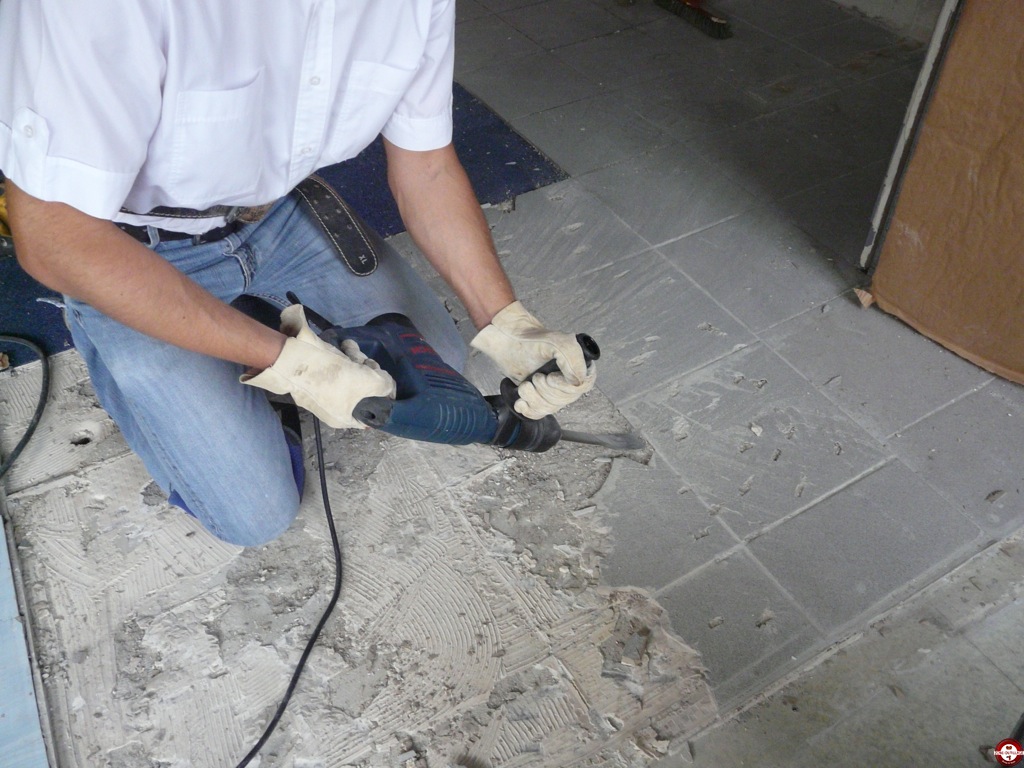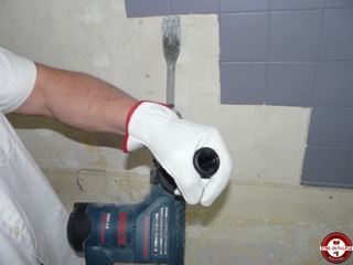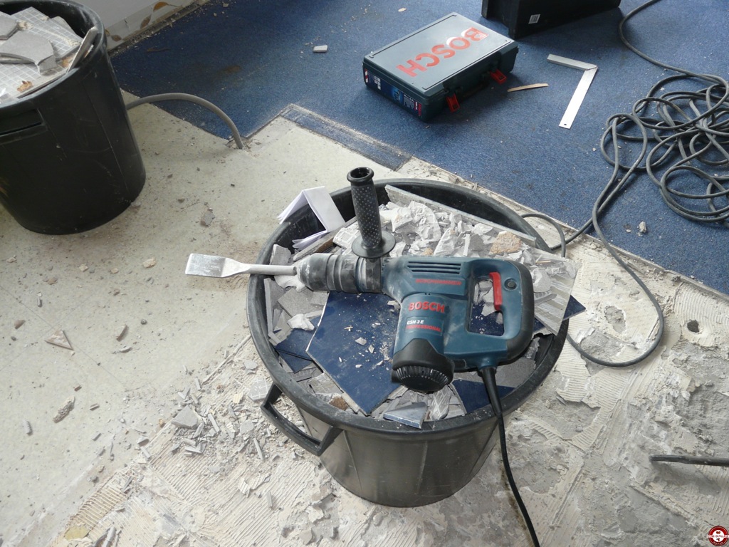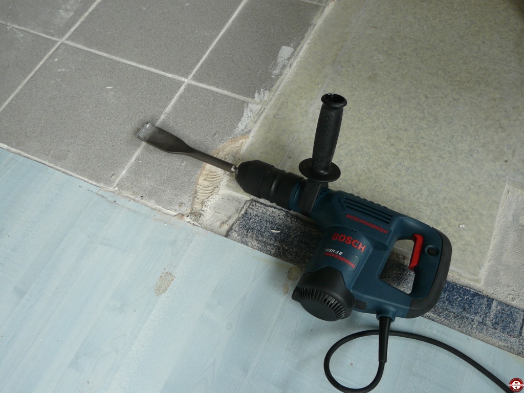 Lors de notre test nous avons sollicité le marteau piqueur GSH 3 E de manière intensive pour enlever un carrelage au sol sur une surface de 30 m2 ainsi que de la faïence sur une surface de 9m2. Nous avons utilisé la Bêche carrelage 260 x 40 mm Ref : 2 608 690 091 fourni avec la machine.