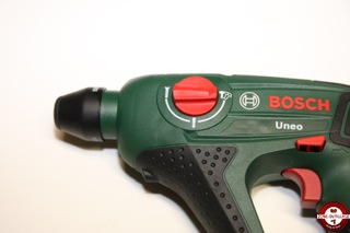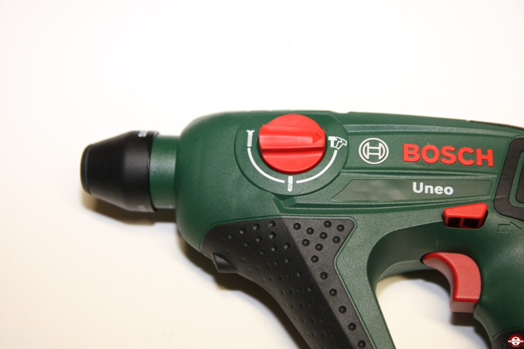 Les poignées sont recouvertes d’un grip et assurent un bon maintien. Le Uneo Bosch dispose d’une molette de réglage 3 positions. Idéal pour les bricoleurs débutants, chaque mode est caractérisé par une indication explicite. La sélection de la vis autorisera un vissage avec un couple élevé. Le foret augmente la vitesse de rotation (0 à 900 tr/min) pour effectuer des perçages dans le bois ou le métal. La position marteau permettra de percer dans le béton et la maçonnerie jusqu’à 10mm, la variation de la vitesse s’effectue à l’aide de la gâchette. L’inverseur de sens tombe bien sous le pouce et l’index. Contrairement aux autres perforateurs, le Uneo Bosch utilise des forets à queue « SDS Quick », le changement se fait sans outils.