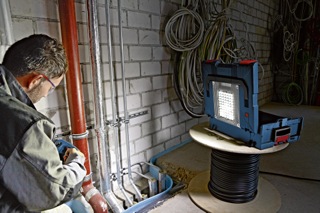 L’alimentation électrique est assurée par une batterie Lithium-Ion de 14,4 ou 18 V. Avec la batterie de 18 V/3,0 Ah complètement chargée et avec une intensité lumineuse maximale, la lampe éclaire pendant 3 h. La lampe peut fonctionner pendant le transport du coffret, ce qui permet aux artisans d’accéder à leur site en toute sécurité, même si le chantier est mal éclairé.