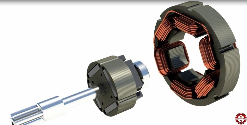 Dans un moteur universel avec charbons, la conduction du courant depuis la batterie jusqu’au moteur est créée par l’ensemble charbon / collecteur (ou inducteur). C’est ce frottement qui crée les étincelles à l’arrière de l’outil. Dans un moteur sans charbon, on retrouve les mêmes éléments que dans un moteur classique, mais le rotor est constitué d’aimants et le stator constitué de bobines + aimants, chargés en alternance positivement ou négativement. Le résultat est immédiat : les pôles s’attirent et se repoussent successivement et le moteur tourne.