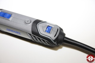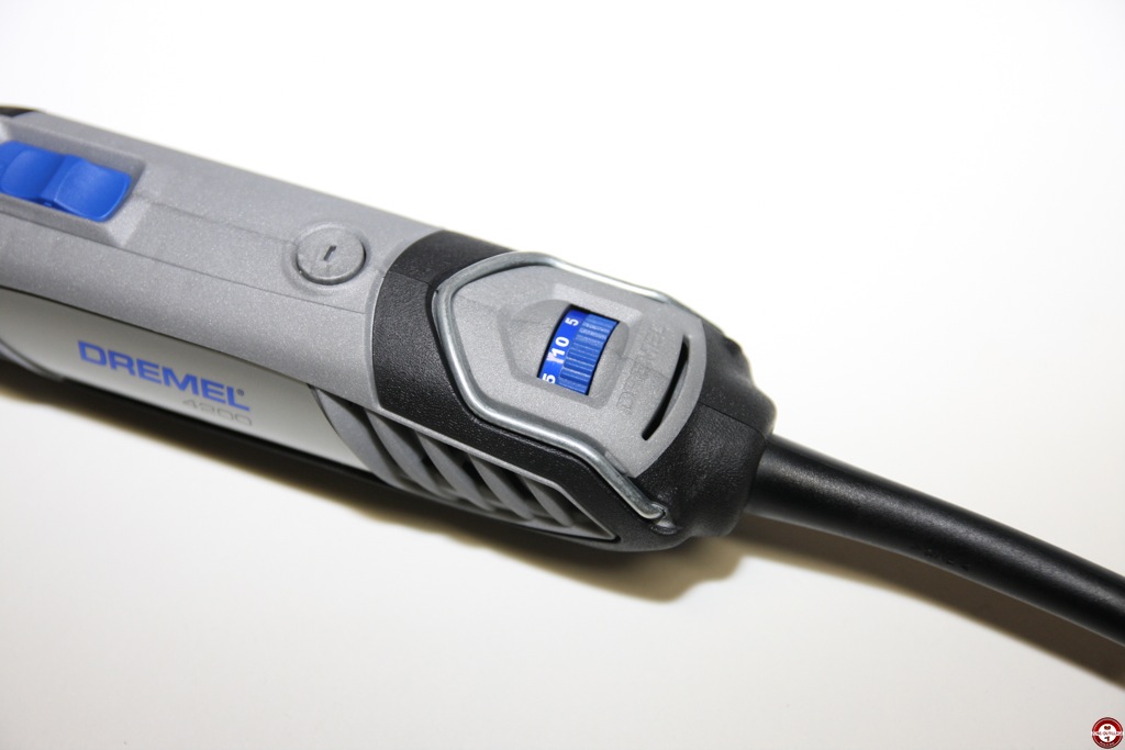 Sur le dessus de l’outil multi-usage Dremel 4200, un variateur permet de régler la vitesse en continu (5 000 - 33 000 tr/min) pour s’adapter aux matériaux tels que le métal, le bois, le plastic ou le verre, la graduation de la vitesse est inscrite en blanc sur fond bleu sur la molette, d’un simple coup d’oeil vous pouvez réguler le régime du moteur.
