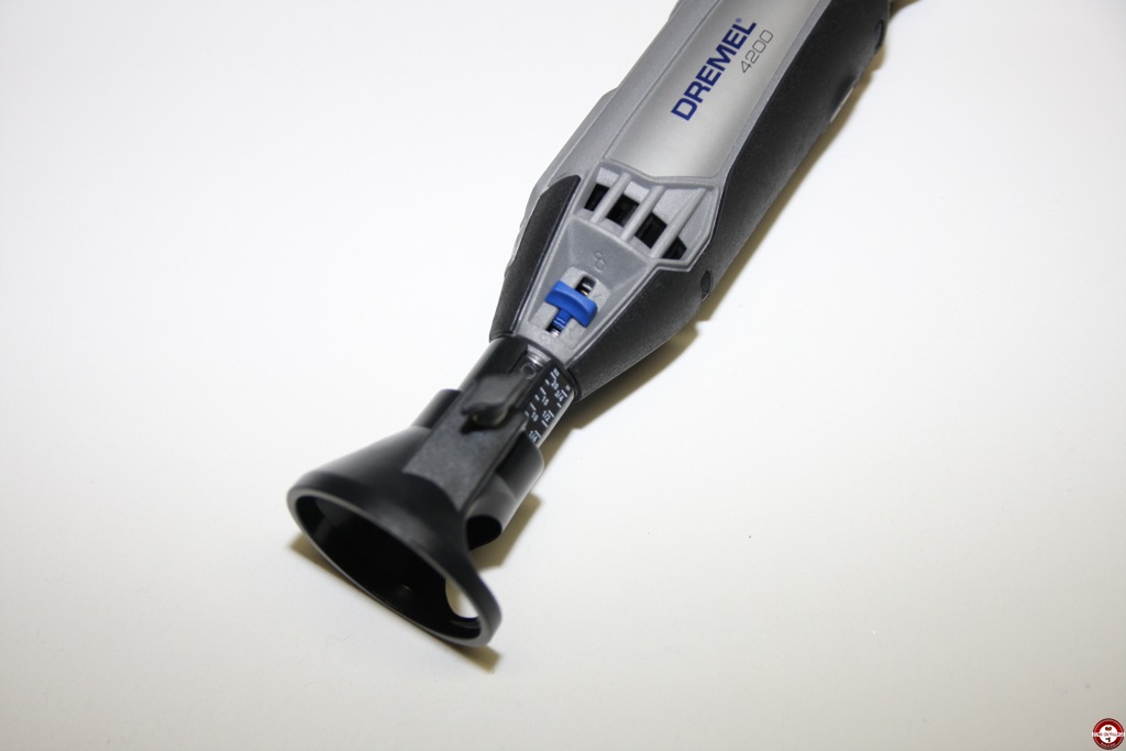 La bague conique sur le devant de la machine améliore la prise en main. Léger (0,66kg) et maniable, sa prise en main est élémentaire. La particularité de ce nouveau Dremel 4200 est son système EZ Change. Les accessoires peuvent être fixés sans clé ni mandrin en quelques secondes. Il suffit de pousser en arrière simultanément les deux petits leviers bleus situés sur le devant de l’outil, insérer l’un des 100 accessoires de votre choix, ensuite de relâcher les deux petits leviers et l’accessoire est fixé de façon sécurisée.
