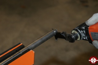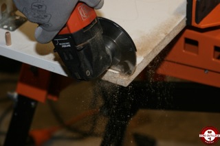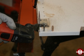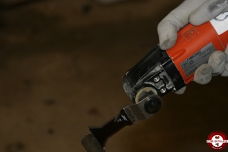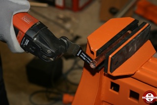 Le changement d’accessoires sans clés n’est pas aussi intuitif et rapide comparé au système du GOP SCE 300 de Bosch professionnal. Le système quickIN permet de changer d’accessoire sans outils, ce qui procure un vrai confort, mais il est difficile à manoeuvrer pour un utilisateur novice. Une fois en place, l’outil est parfaitement maintenu. Le réglage de l’accessoire se fait sur 8 positions sur le multimaster et 6 positions sur le supercut. Lors du changement d’accessoire sur le multimaster, nous avons remarqué que l’interrupteur marche/arrêt est placé juste à proximité du levier qui sert au changement d’accessoire. Il est nécessaire de débrancher la machine pour ne pas prendre de risque de la mettre en marche. Le multimaster est doté d’un porte outils 8 pans contre un porte outils 6 pans sur le supercut, donc pas de compatibilité d’accessoire possible entre les deux outils. Les 5 mètres de câble d’alimentation électrique offrent une bonne liberté de mouvement, utile lors des travaux d’agencement ou lors de ponçages. Nous avons testé des découpes dans l’acier et le cuivre.