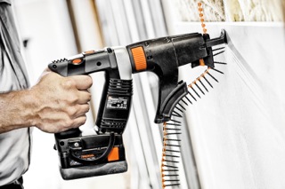 Le système de transport de bande, breveté, équipé d'éléments en acier et de bagues de guidage, maintient les vis en bande avec fiabilité et précision. L'utilisateur a ainsi une main complètement libre, pour exercer par exemple une pression sur des plaques de plâtre ou travailler au plafond. Le chargeur de vis peut être utilisé sans aucune limitation dans les applications de longue durée.