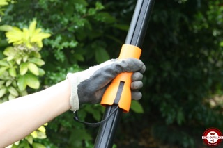 Au millieu de la perche Fiskars UP86 il y as une poignée orange sur lequel on tire et le ruban noir qui descend le long du manche avait fait un tour complet autour de la base de la perche juste au dessus de la petite capsule orange située tout a fait en bas de la perche