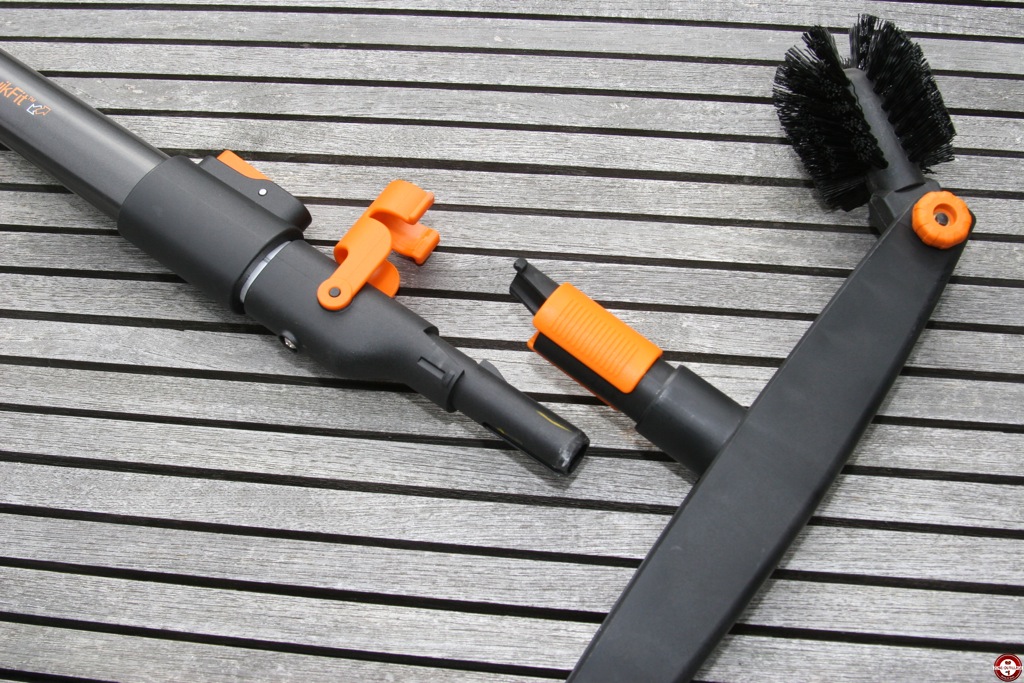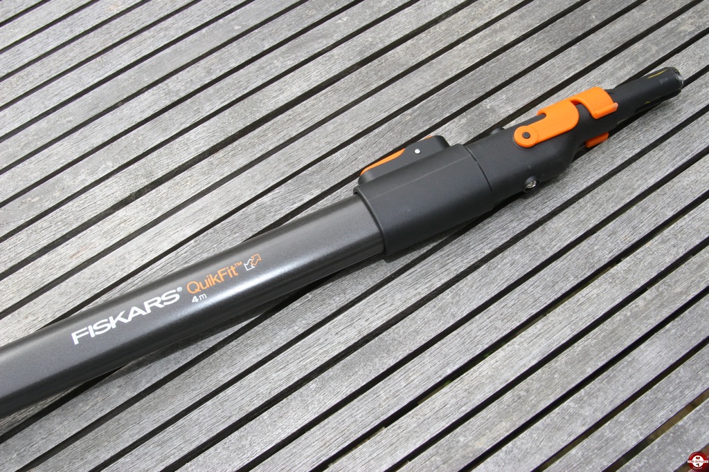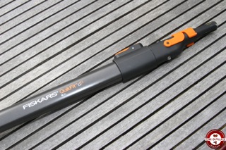 Le manche télescopique est agréable à l’utilisation, il est disponible en deux longueurs 140-250 cm et 230-400cm de quoi atteindre 4 et 5 mètres sans avoir à monter sur une échelle. Il permet également d’adapter une multitude d’accessoires jardin Fiskars (binette, sarcloir, griffes, râteaux, balais à feuilles, couteau grattoir, dresse-bordures, coupe-branche à enclume)