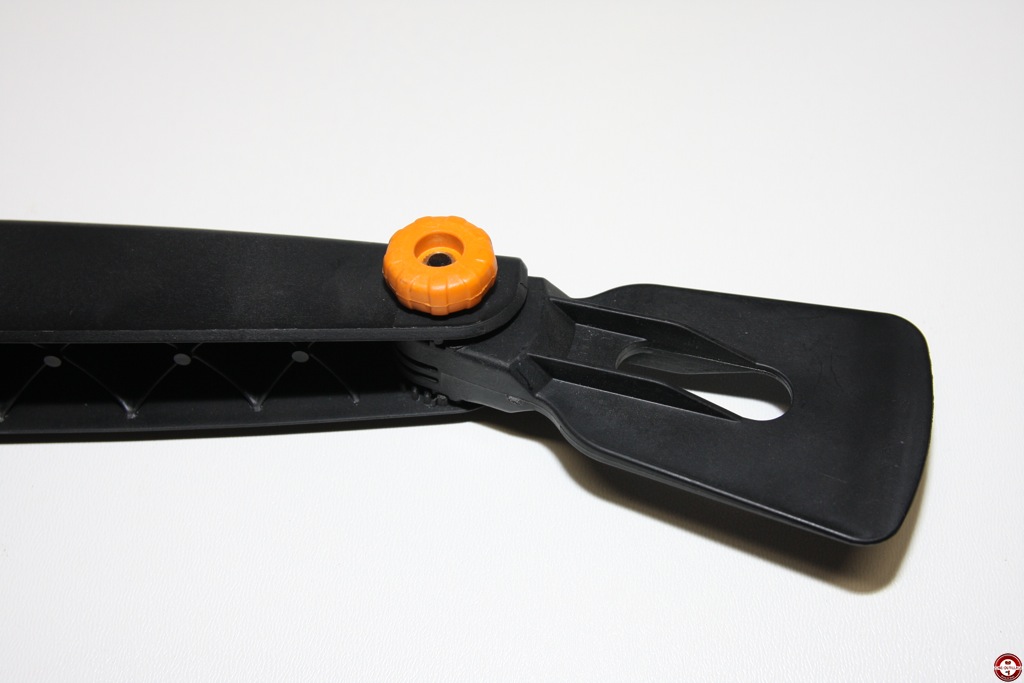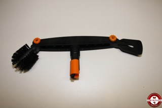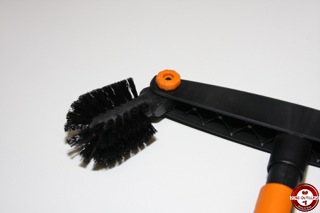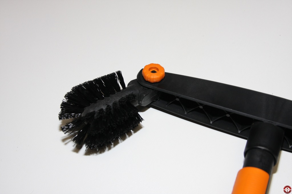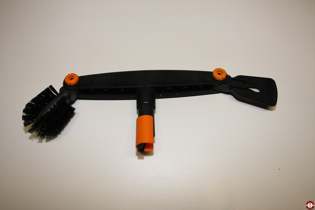 Le nouveau nettoyeur de gouttières Fiskars QuikFit est un outil interchangeable qui s’adapte sur un manche télescopique. Composé d’un grattoir qui permet de repousser les détritus accumulés dans la gouttière et à l’autre extrémité, une brosse ronde qui sert à éliminer les résidus et à brosser le bord de la gouttière. Les deux têtes de l’outil ont un angle ajustable afin de s’adapter à la configuration de la gouttière à nettoyer.