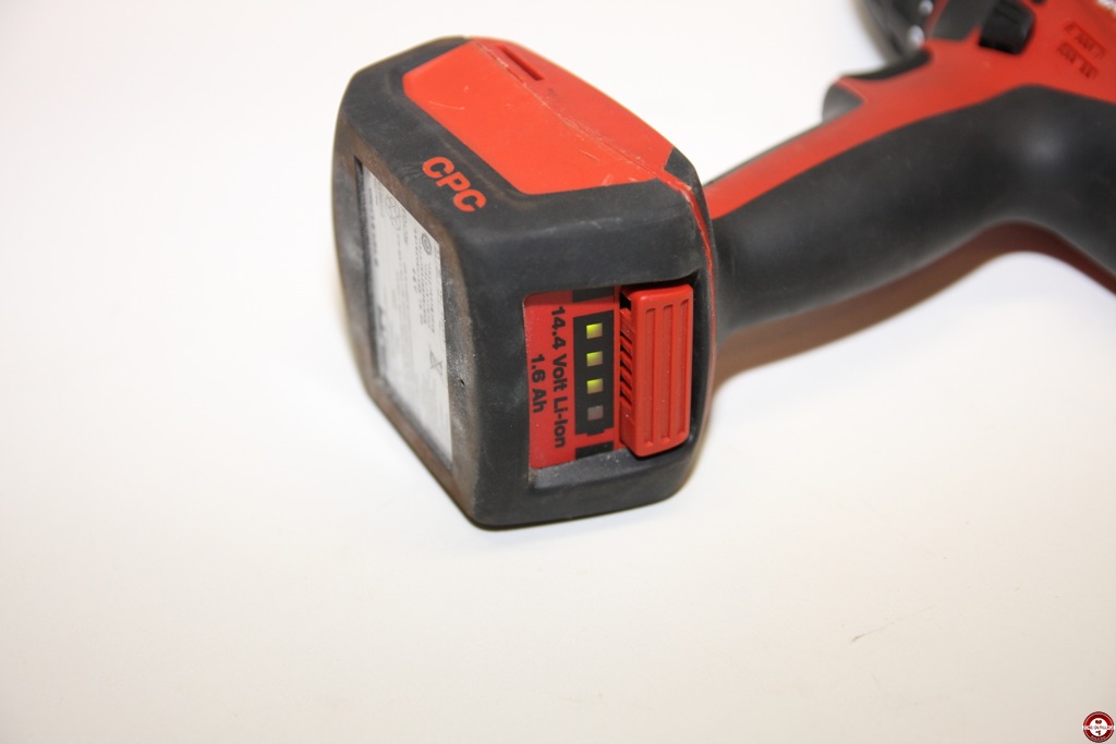 Sur le modèle HILTI SFC 14-A, le fabricant propose une batterie 1,6 Ah pour la légèreté et une batterie de 3,3 Ah pour une meilleure endurance. Elle s’insère par un système de glissière. Un témoin de charge est présent sur la batterie, il faudra appuyer sur la partie arrière pour afficher la charge restante, un système perfectible, car il le système n'est pas très sensibles.