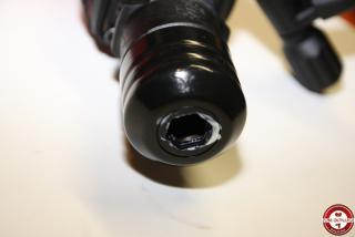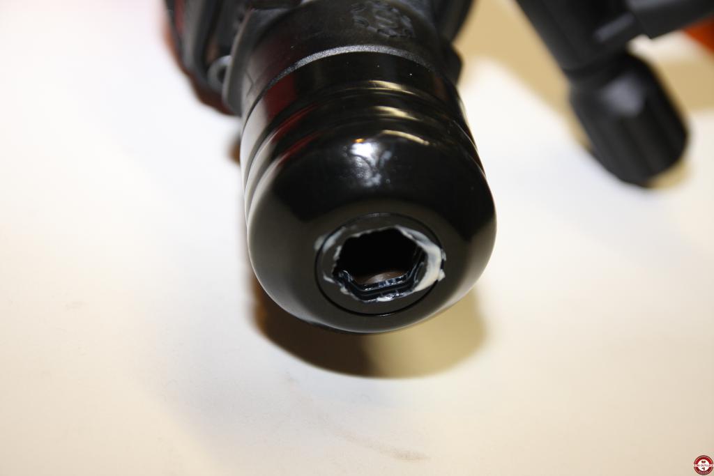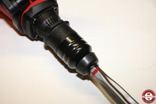 Le second bouton permet de réduire la puissance de burinage de 70 %. Une fois activé, un témoin jaune s’allume. Il suffira de réappuyer sur le bouton pour utiliser le burineur Hilti TE 800-AVR à pleine puissance. Le porte-outil est de type TE-S, qui présente la particularité d’avoir un diamètre supérieur au SDS MAX apportant ainsi une surface de frappe plus importante pour de meilleures performances.