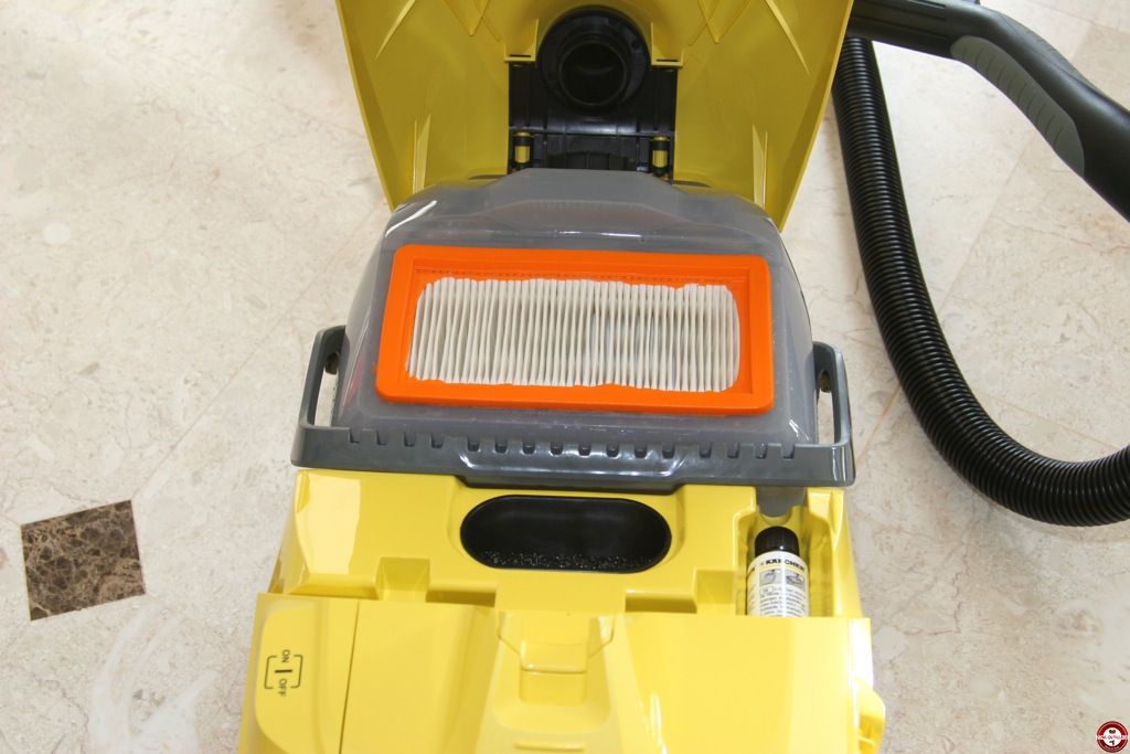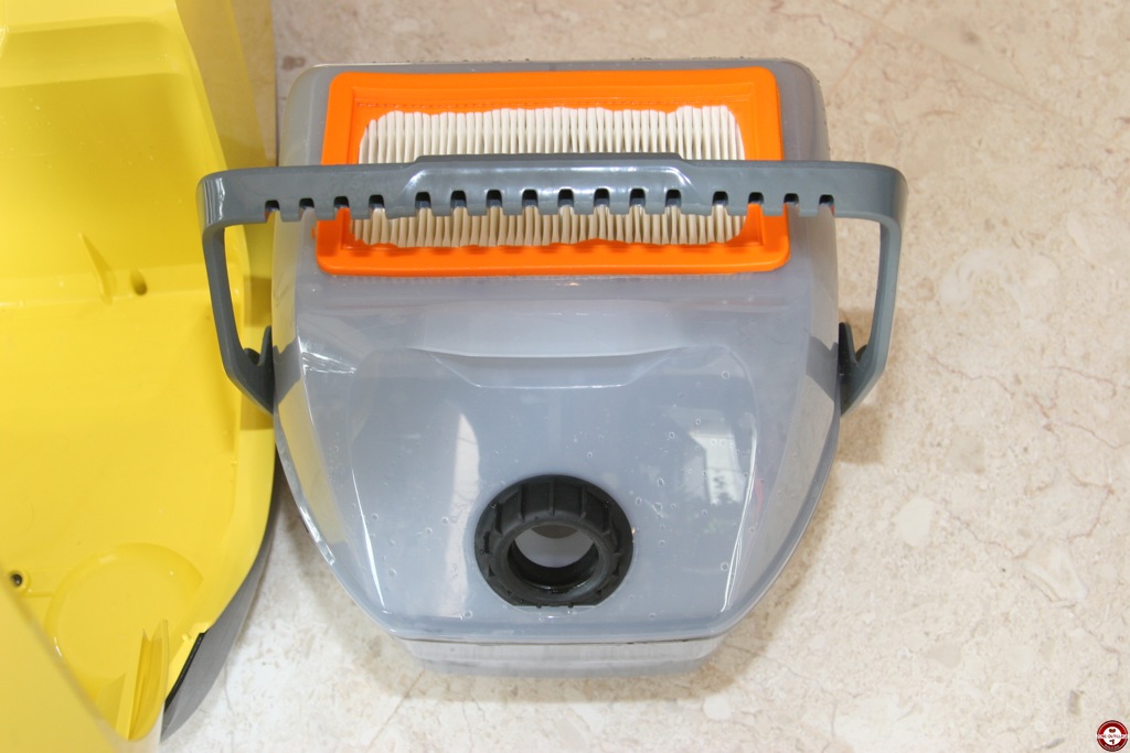 On retrouve facilement les trois filtres de l'appareil : Le premier situé dans le réservoir d'eau permettant de capturer efficacement les salissures aspirées, le second intermédiaire sur le dessus du réservoir à eau qui capture les particules protégeant le moteur et le troisième filtre HEPA 12 situé à l'arrière de l'aspirateur qui a pour fonction d'éliminer les allergènes et les odeurs.