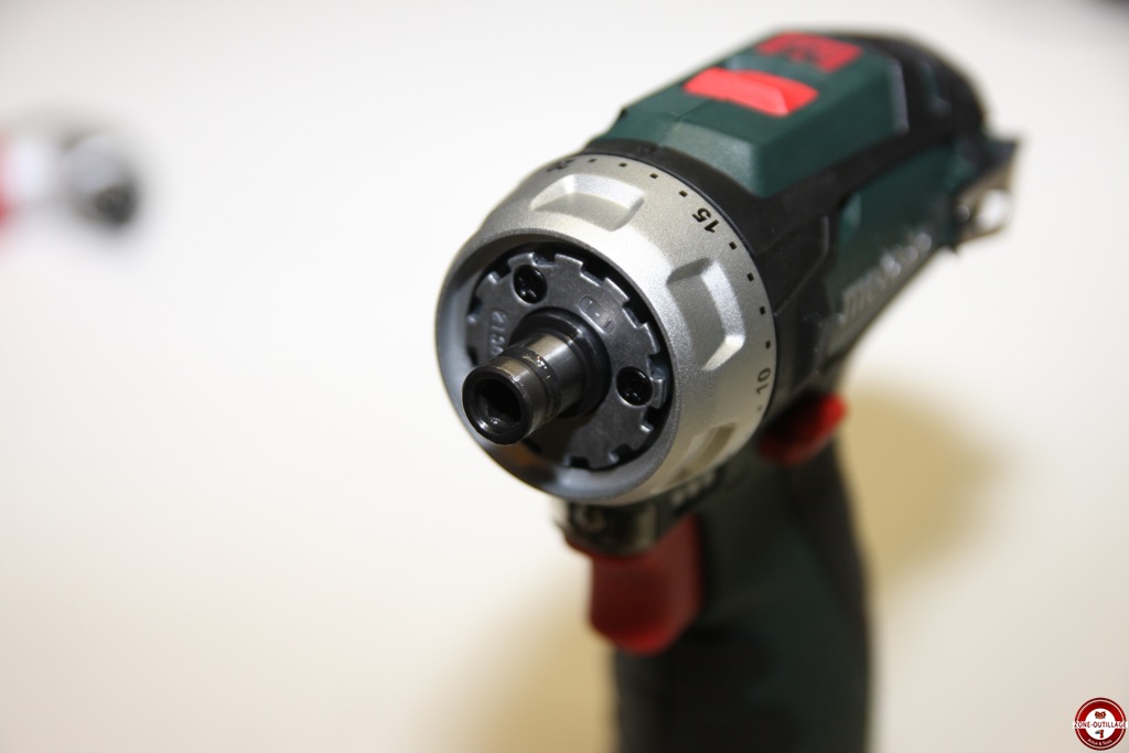 L’outil est doté de deux vitesses (0 - 360 et 0 - 1400 tr/min) et d’un couple de rotation maximum de 34 Nm. L’outil est livré avec un mandrin autoserrant Quick et un renvoi d’angle Quick. Ils se verrouillent et se déverrouillent très simplement. La bague de réglage de couple est petite, mais reste accessible. Un indicateur de charge restante est placé sur le côté de l’outil.